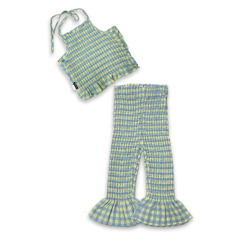 -Плиссированный топ с открытой спиной и расклешенные брюки.