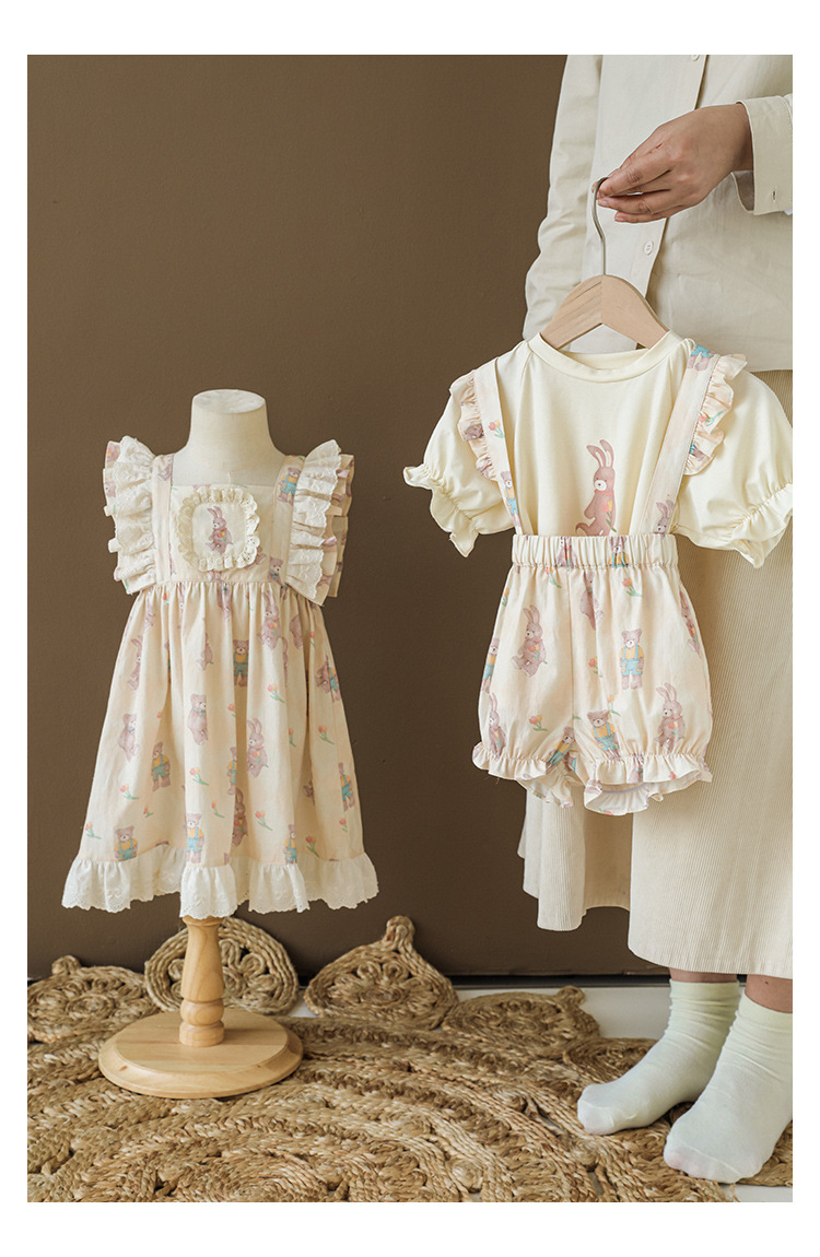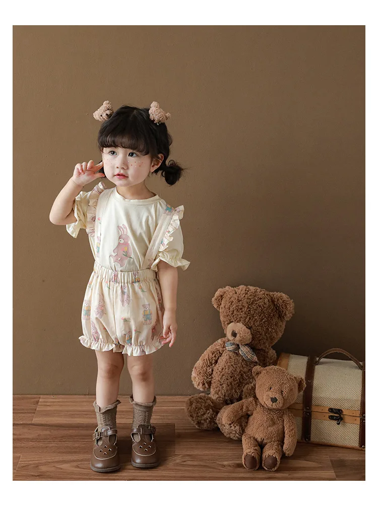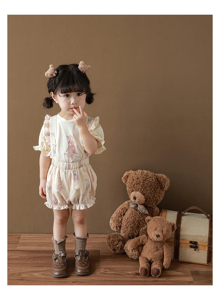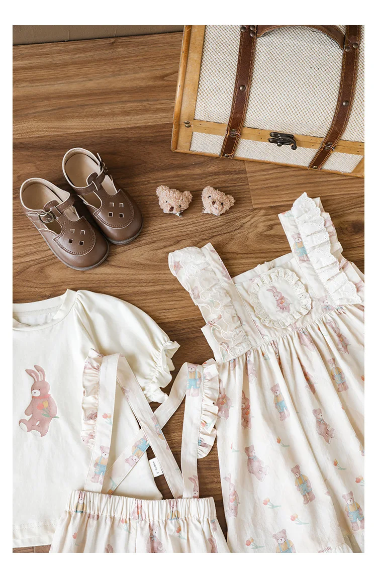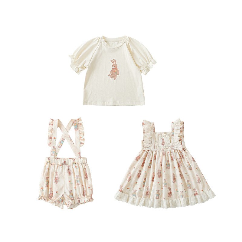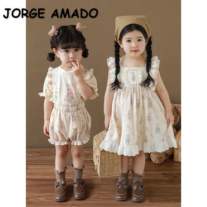 Новые летние Мультяшные Детские комплекты для девочек-футболка с короткими рукавами и шорты на подтяжках и кружевное платье с летными рукавами E0234