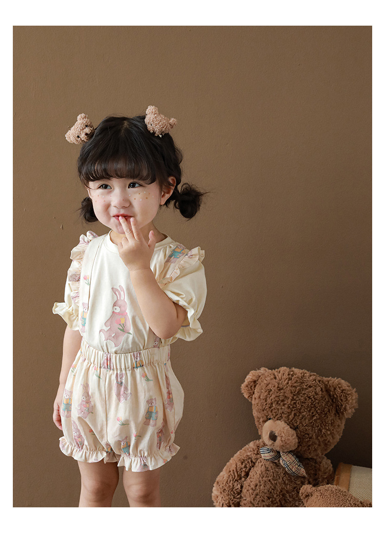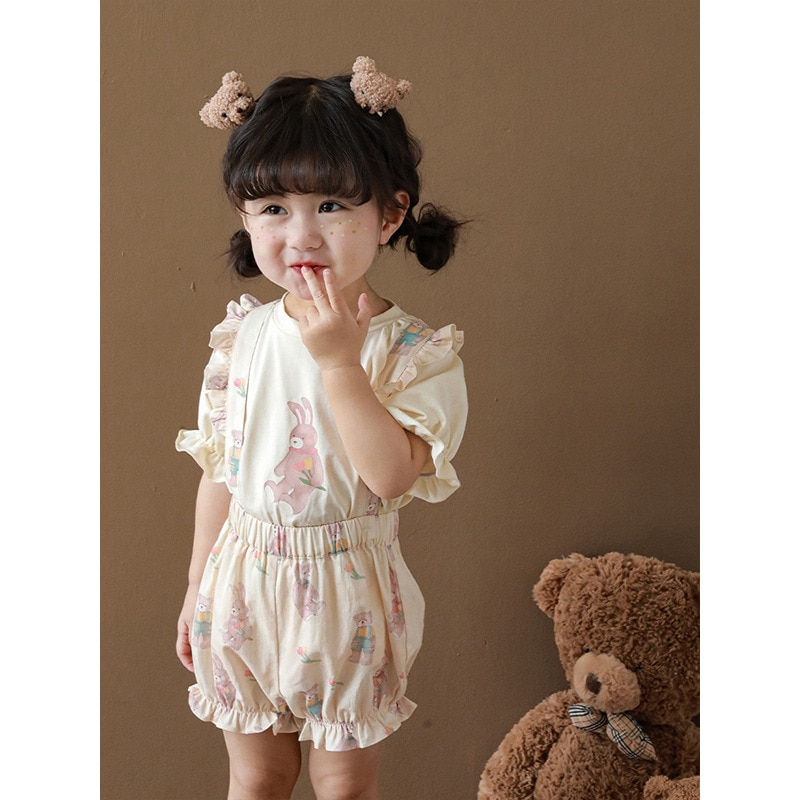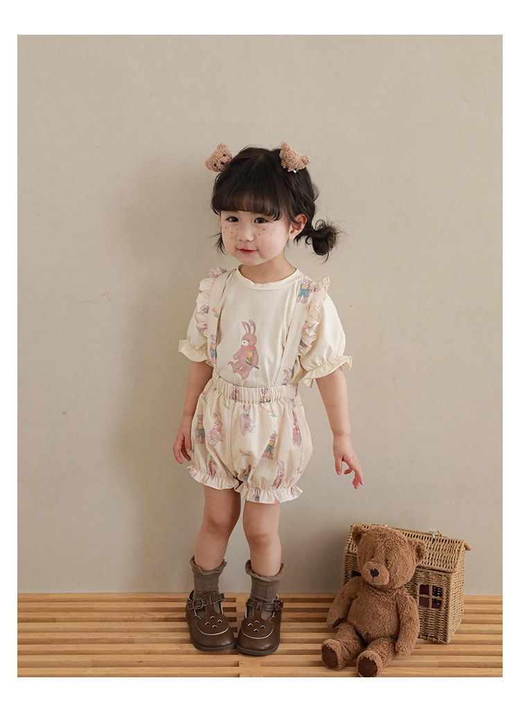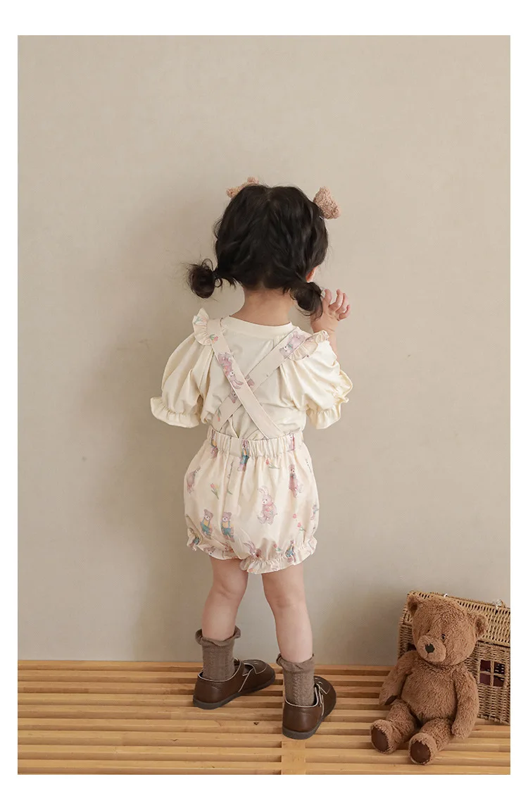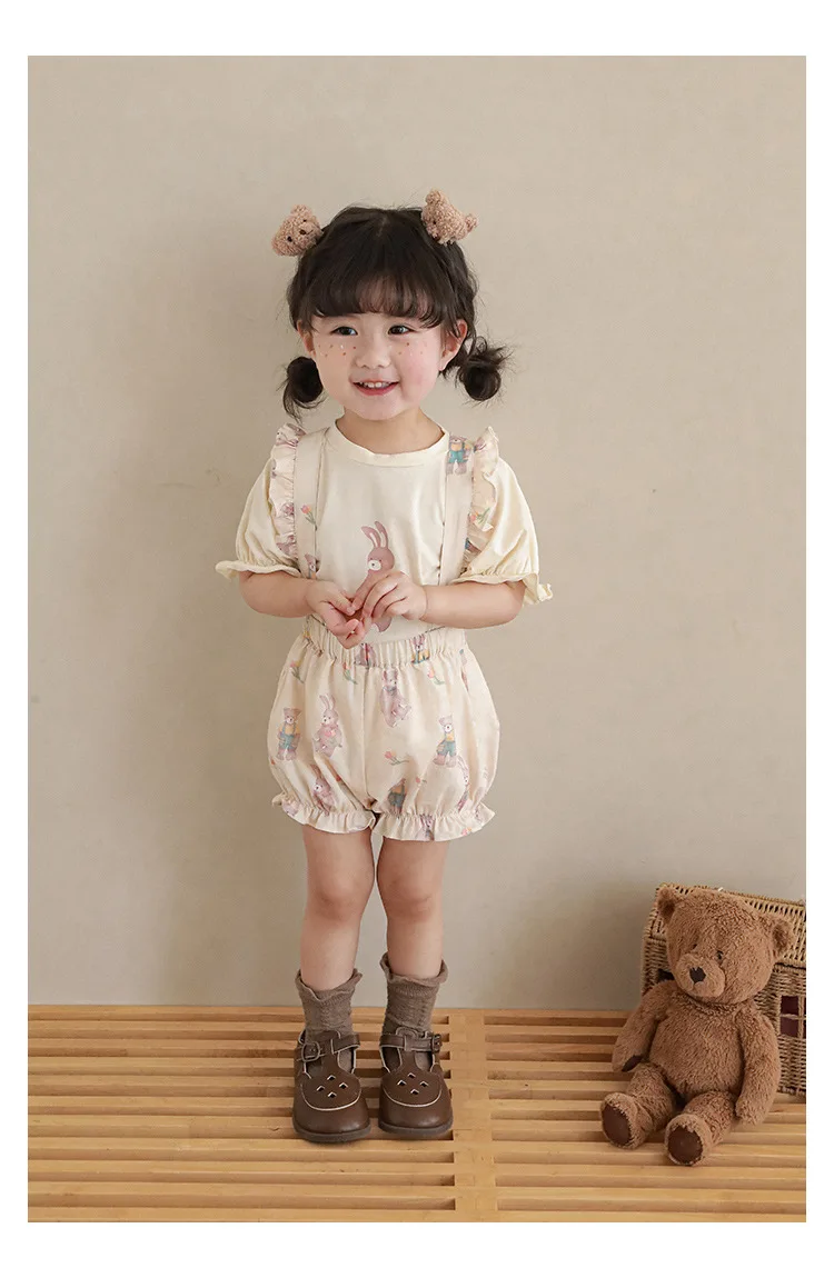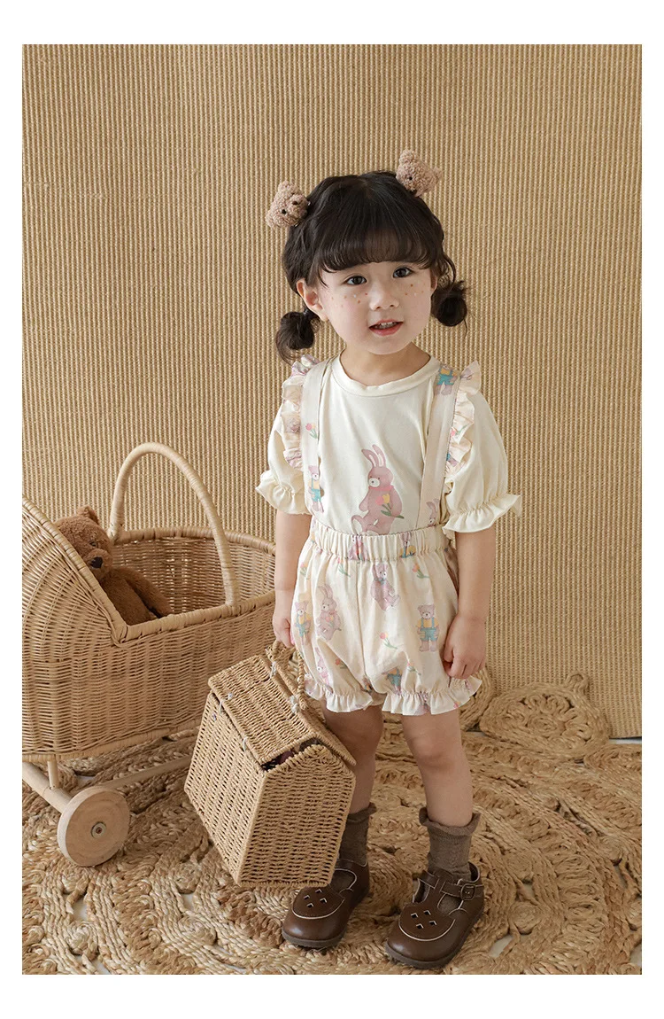 Новые летние Мультяшные Детские комплекты для девочек-футболка с короткими рукавами и шорты на подтяжках и кружевное платье с летными рукавами E0234