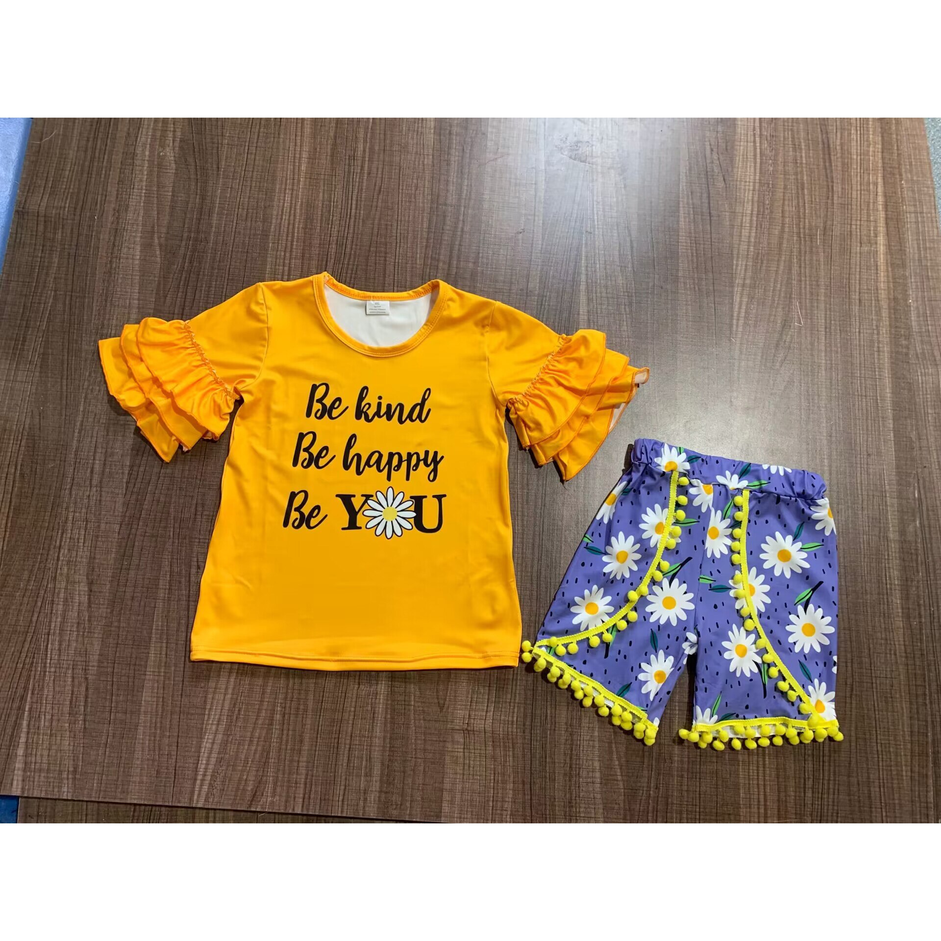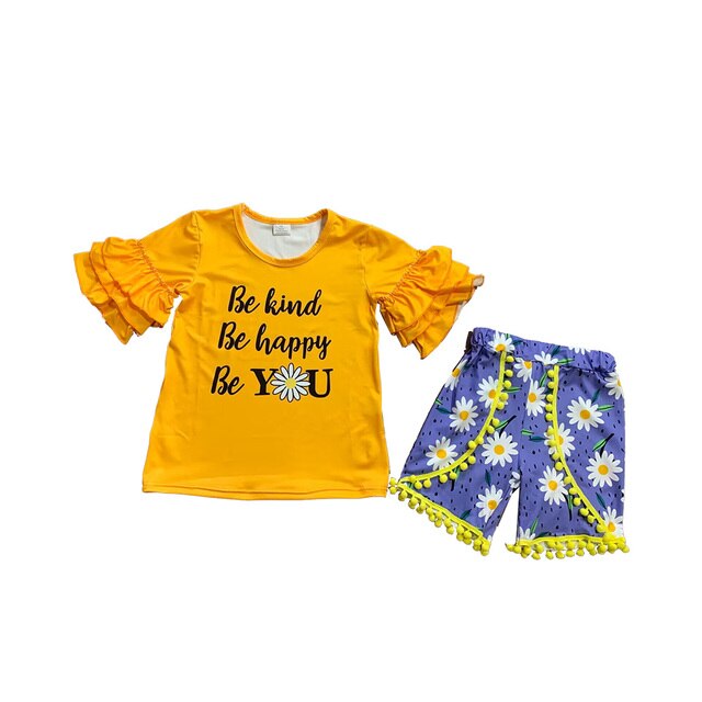 Новинка, летняя одежда для девочек с маргаритками, желтые шорты с помпонами, Женский комплект