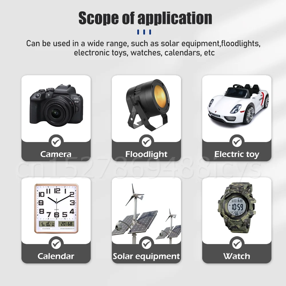 Использование для: светодиодного света, электрических игрушек, пультов дистанционного управления, камеры, электронного слухового аппарата, КПК, брелков для глюкометра, фонарей, осветителей, инструментов, освещения и т. Д.