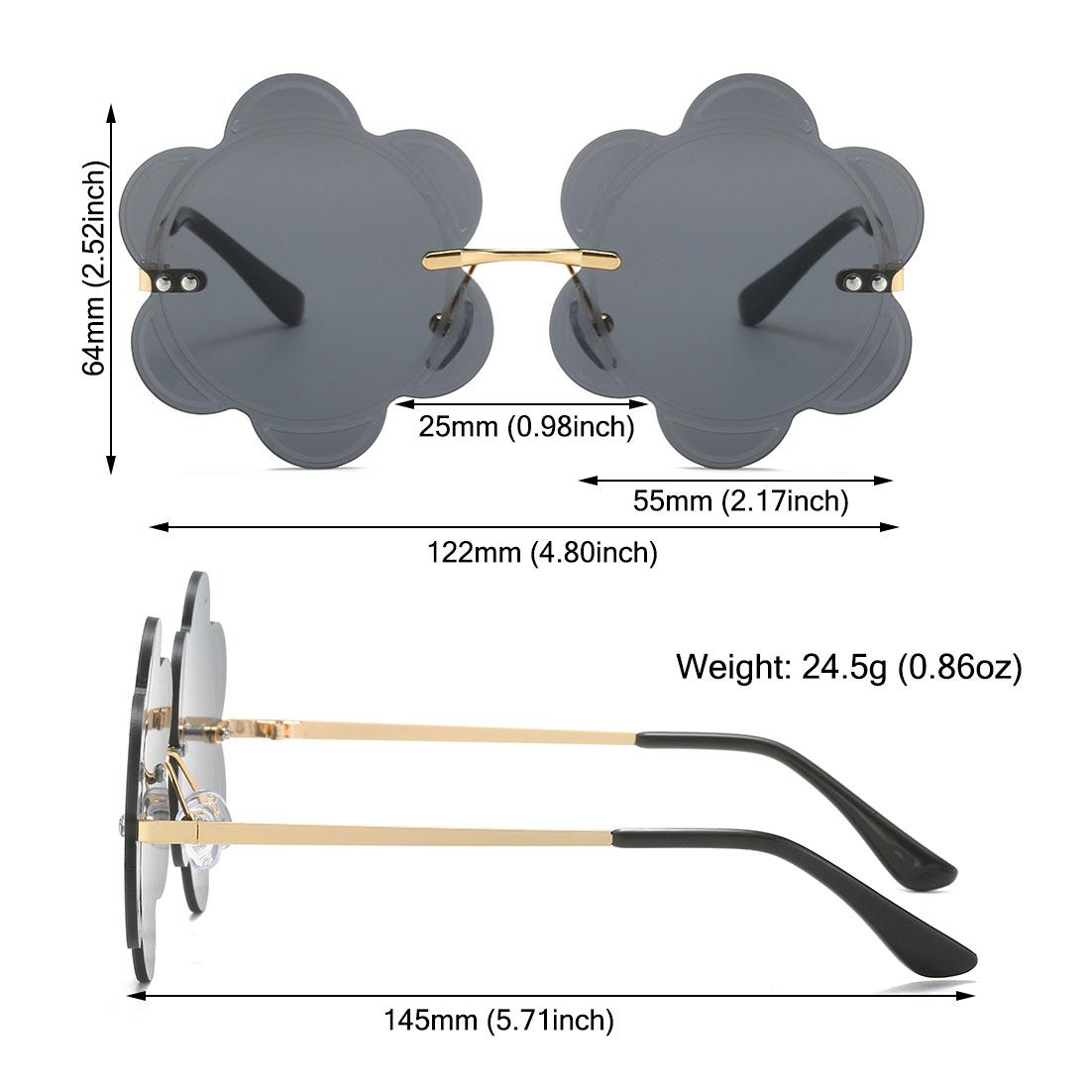 Название продукта: солнцезащитные очки с цветочным дизайном Стиль: Модный, Ретро стиль Цвет: 7 цветов на ваш выбор Материал дужек: металл Материал линз: поликарбонат Тип поляризации: не поляризованный Размер продукта: Общая ширина: 122 мм (4,80 дюйма) Ширина линз: 55 мм (2,17 дюйма) Высота линз: 64 мм (2,52 дюйма) Ширина носоупора: 25 мм (0,98 дюйма) Длина дужек: 145 мм (5,71 дюйма) Вес: 24,5 г (0,86 унций) Посылка в комплекте: 1 * солнцезащитные очки Примечание: 1. Есть разница в 2-3% в соответствии с ручными измерениями. Пожалуйста, внимательно проверьте размер перед покупкой товара. 2. Обратите внимание, что из-за светильник и экрана возможна небольшая разница в цвете.