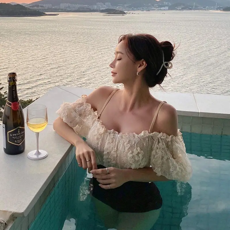 Новый корейский сексуальный купальник на бретелях с открытым плечом и кружевным узором с короткими рукавами Тонкий и скрывающий живот Весенняя модель