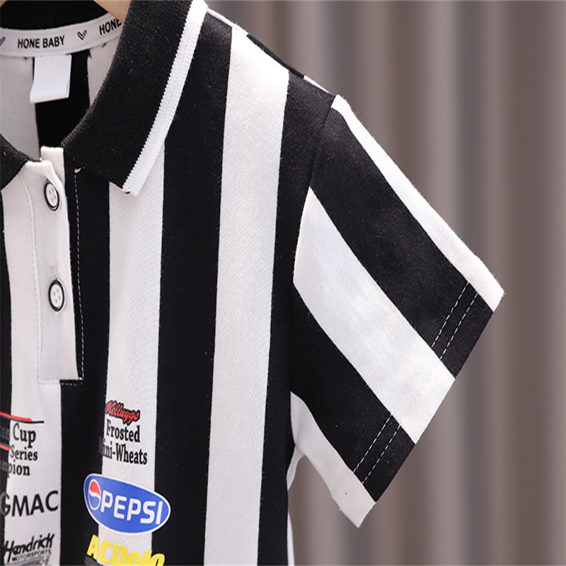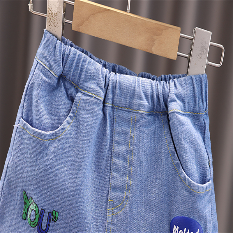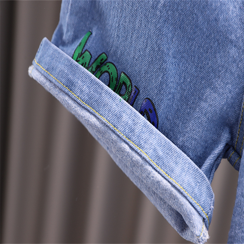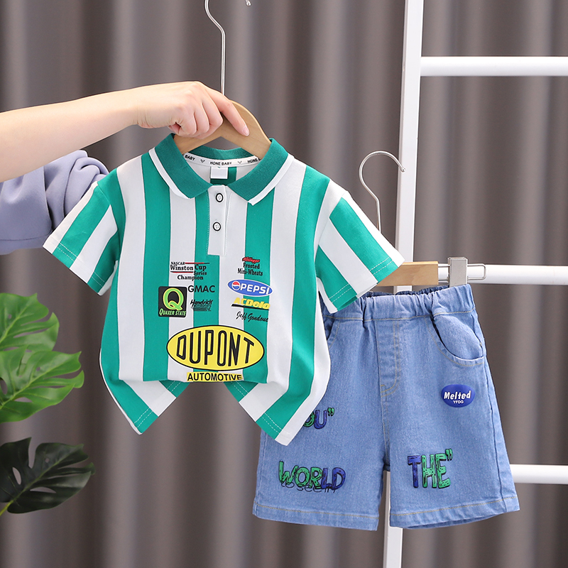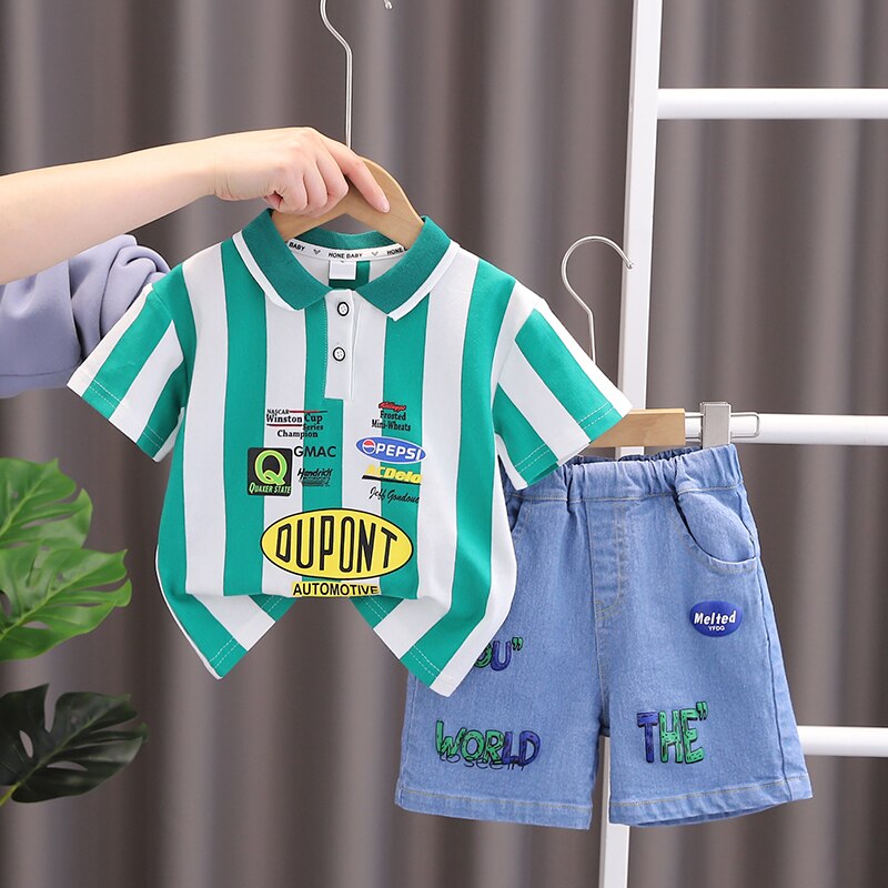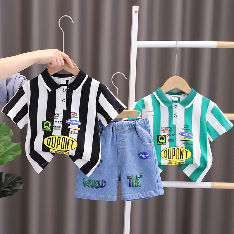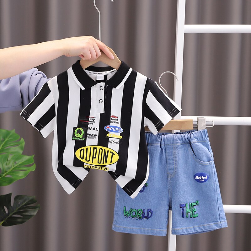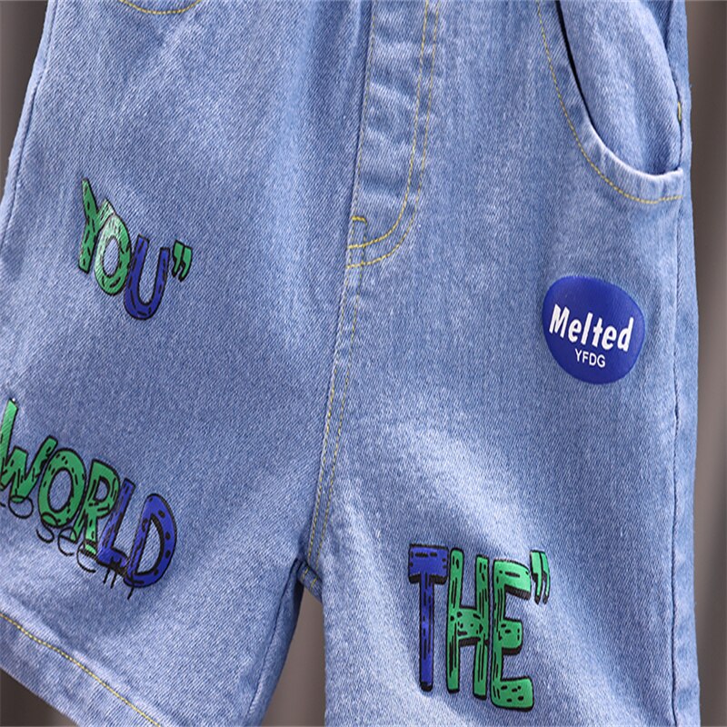 Новый летний детский комплект для мальчиков и малышей, повседневные джинсовые шорты в полоску с короткими рукавами и буквенным принтом Модный комплект из двух предметов