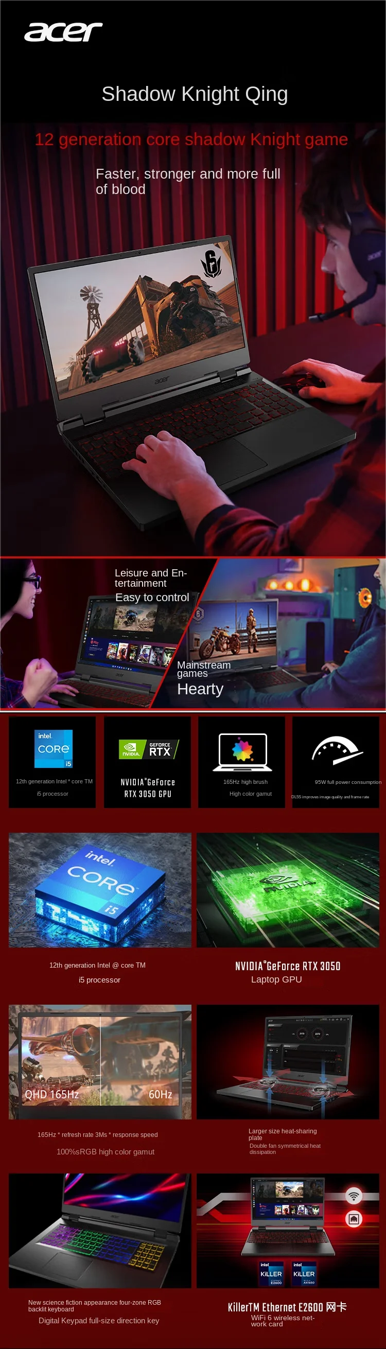 Новый оригинальный игровой ноутбук Acer Shadow Knight Qing, Intel I5-12500H RTX3050 E-Sports, 15,6 дюймов, 165 Гц, игровой ноутбук с IPS экраном