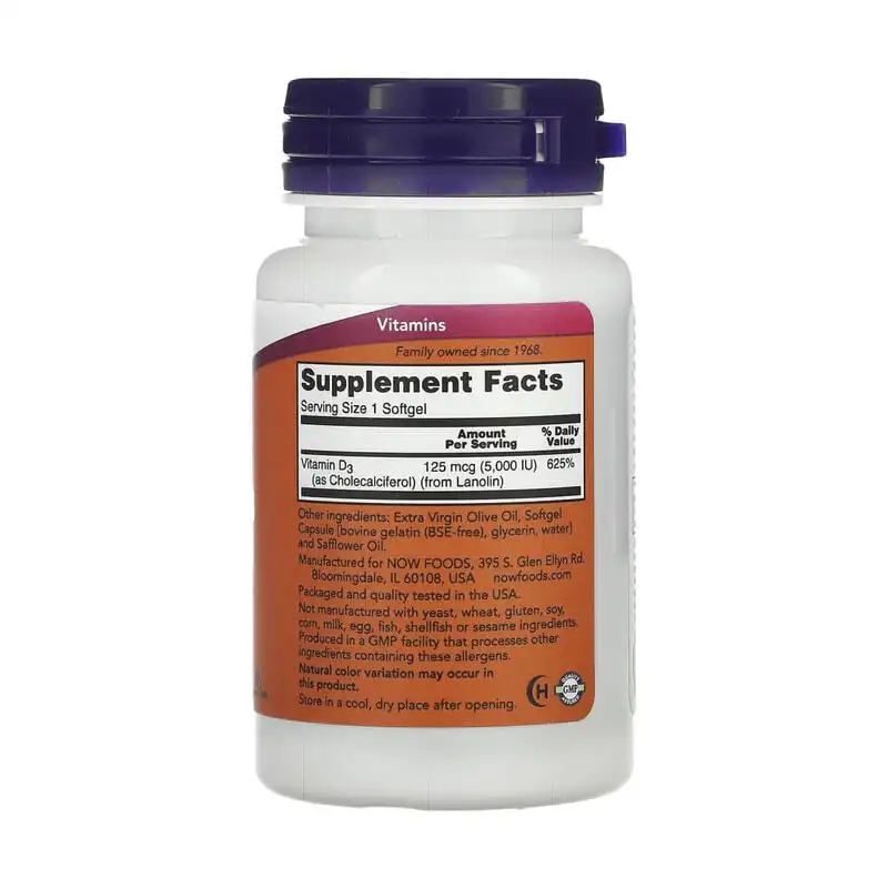 NOW Foods Vitamin D-3 Витамин D3 125 мкг (5000 МЕ) 120 гелевых капсул