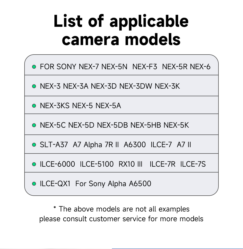 Lumix DMC-3D1, Alpha 7, Alpha a7, Alpha 7R, Alpha a7R II, Alpha a7S, Alpha a7S II, Alpha a3000, Alpha a5000, Alpha a6000, NEX-3, NEX-5, NEX-5N, NEX-5R, NEX-5T, NEX-6, NEX-7, NEX-C3, NEX-F3, SLT-A33, SLT-A35, SLT-A37, SLT-A55V, ILCE-QX1, кибер-выстрел DSC-RX10, кибер-выстрел DSC-RX10 II, ZV-e10 и многое другое