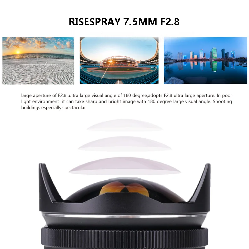 Объектив RISESPRAY 7,5 мм F2.8 рыбий глаз 180 ° для Sony NEX E-mount для Fuji XF APS-C / Panasonic Olympus Macro 4/3 беззеркальных камер J