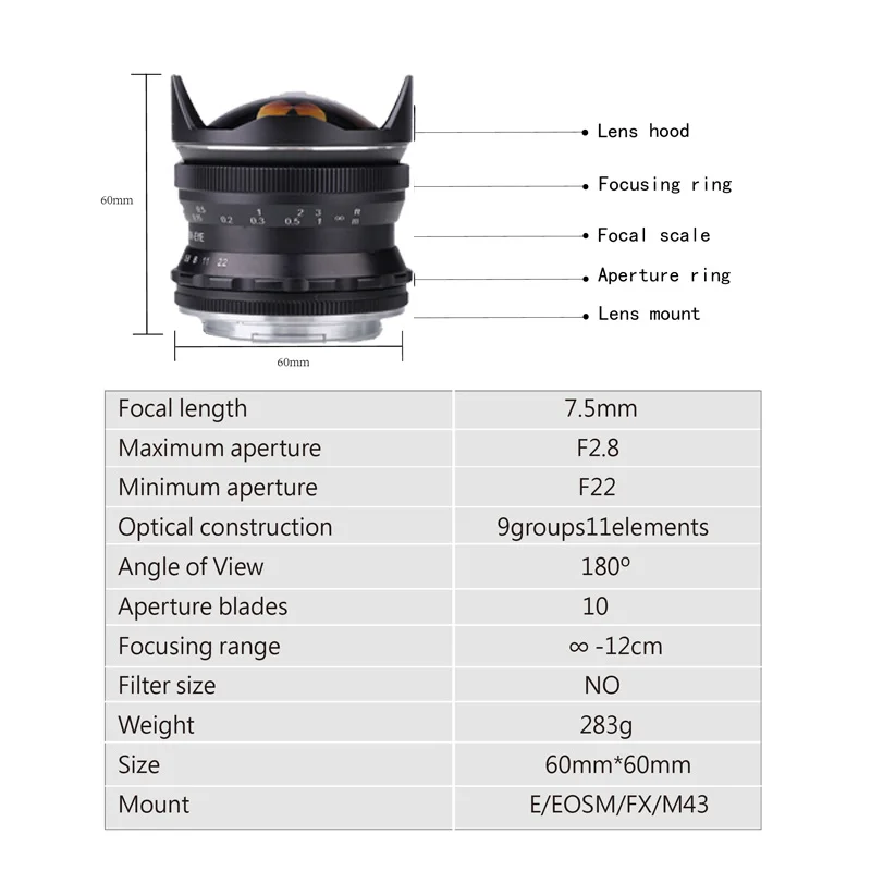 1. Компактный функциональный Объектив: 7,5 мм/f2.8 объектив рыбий глаз с максимальной диафрагмой F/2,8. Ближайший к нему и расстояние фокусировки составляет 0,15 м; Широко фокус в 190 градусов.