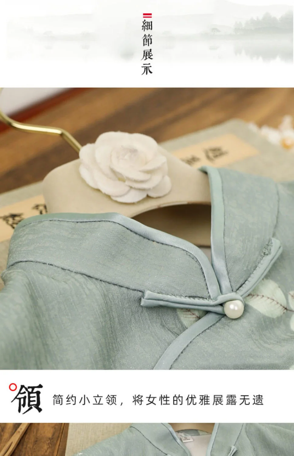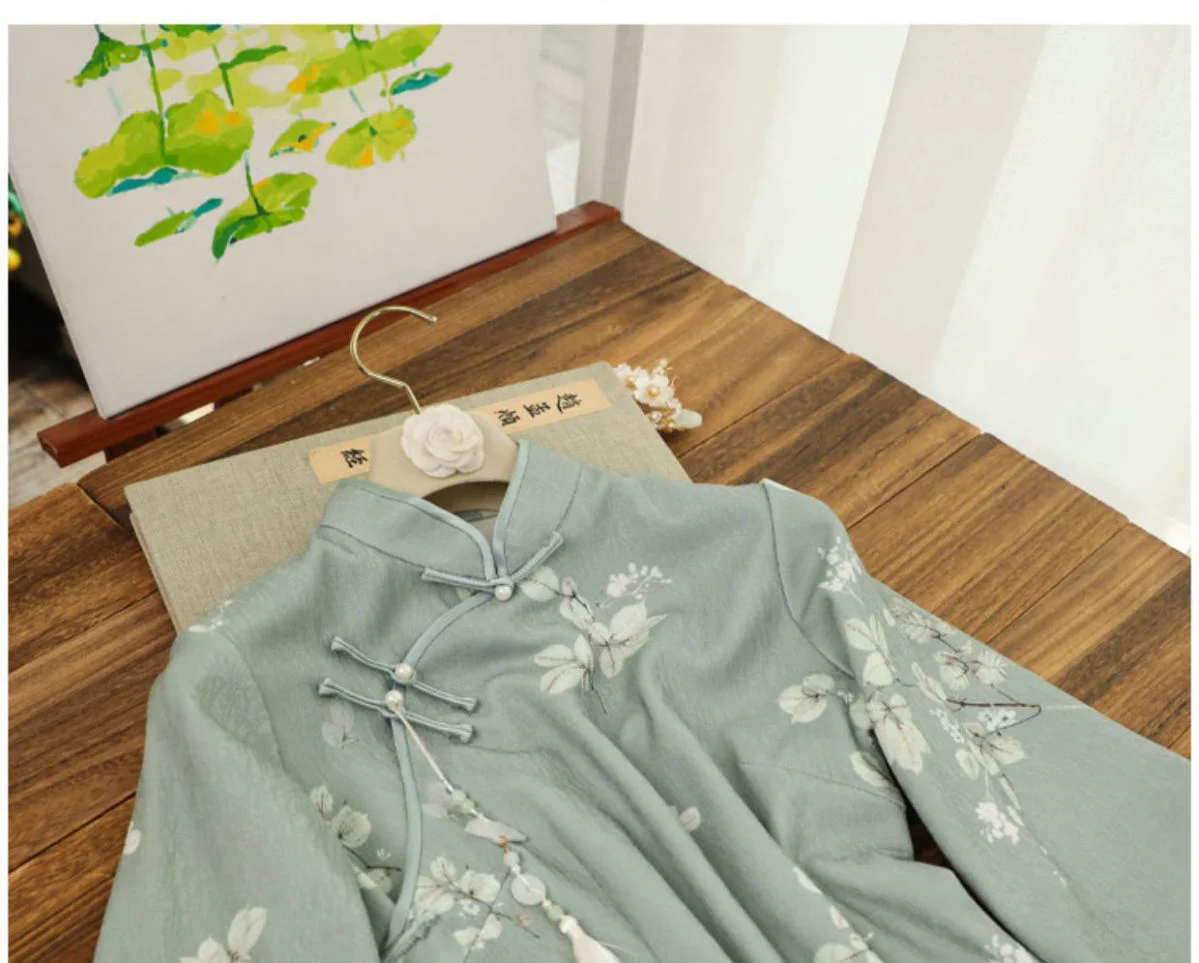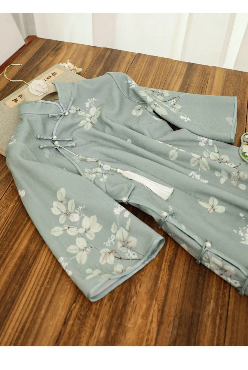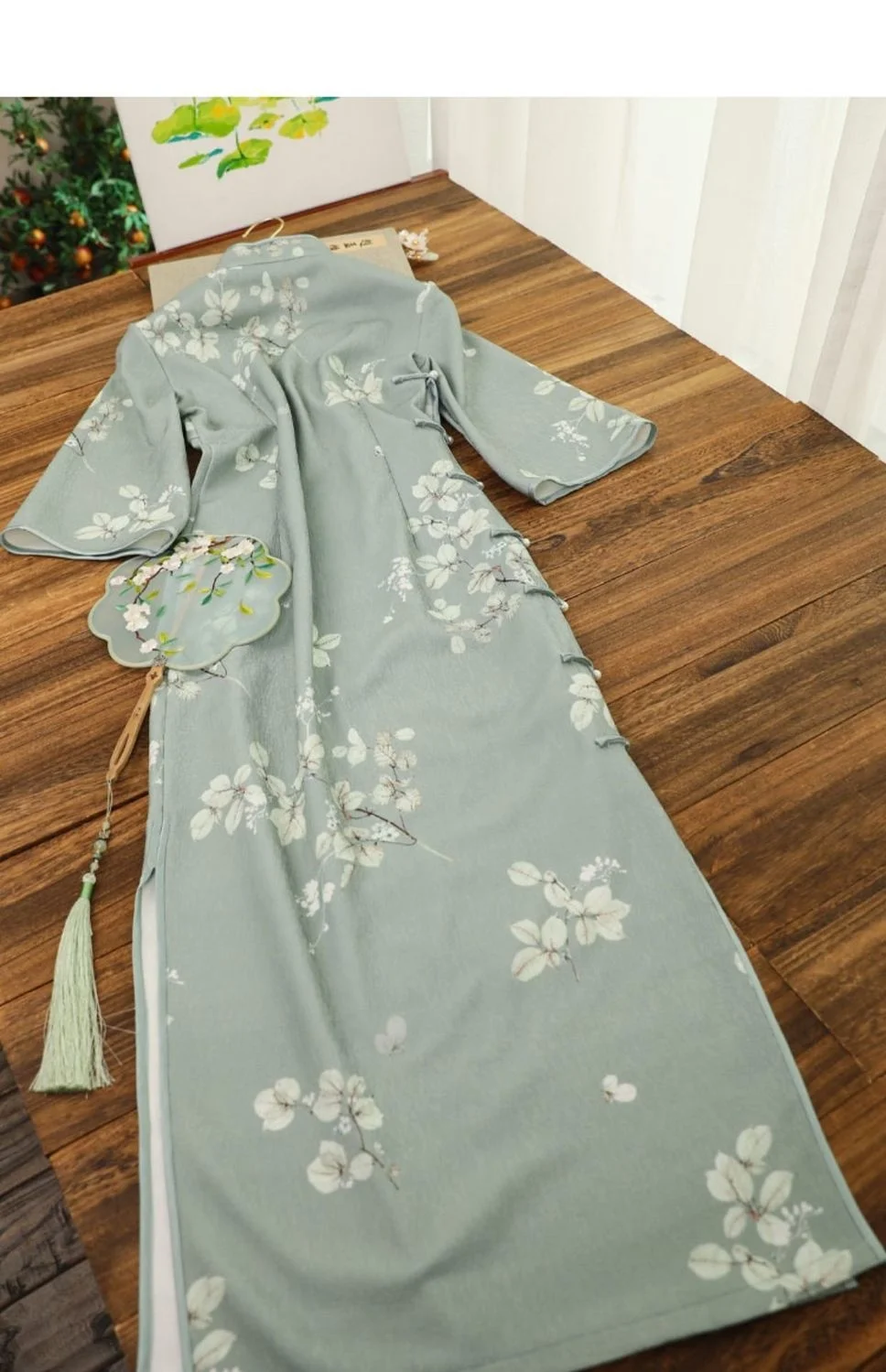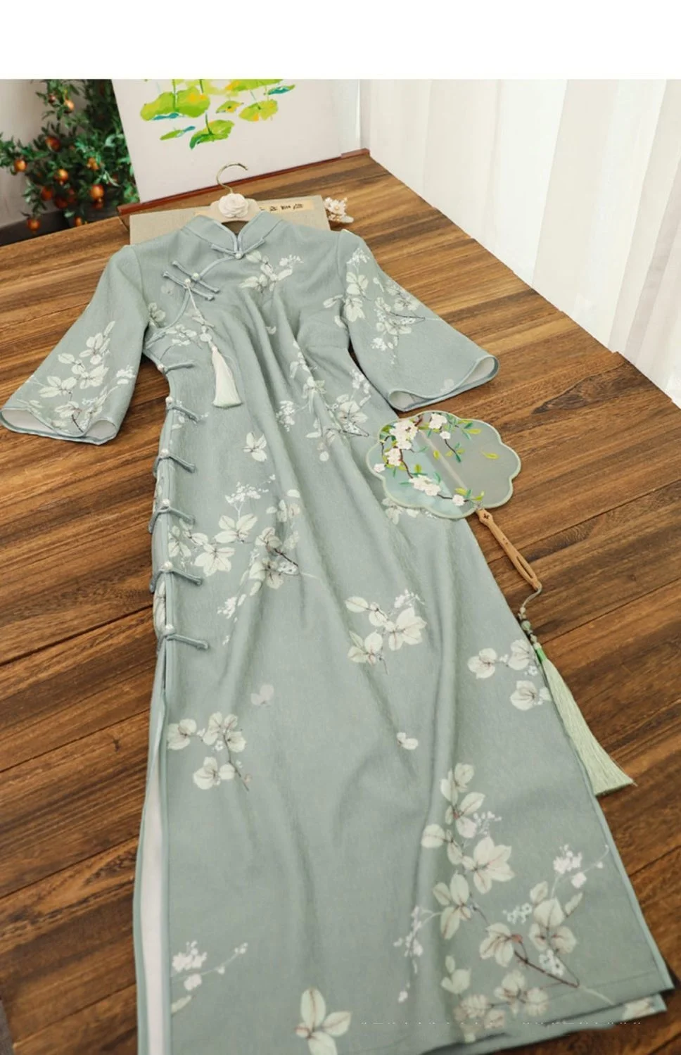 Облегающее Повседневное платье-Ципао с перевернутыми рукавами и зелеными цветами для женщин, Осеннее современное улучшенное винтажное китайское традиционное платье-Ципао, новинка