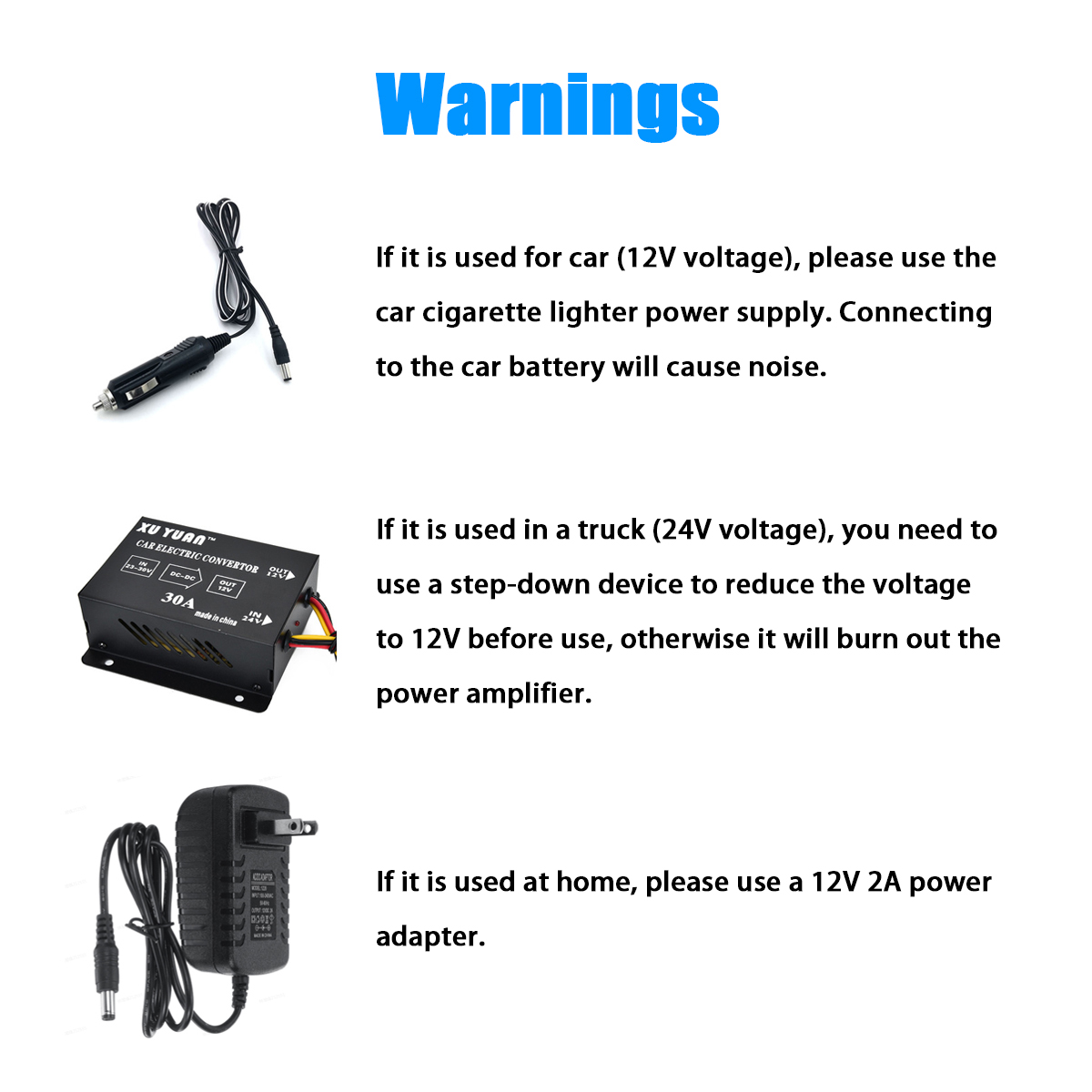 -Если он используется в грузовике (напряжение 24 В), вам необходимо использовать понижающее устройство, чтобы уменьшить напряжение до 12 В, прежде чем его можно будет использовать. В противном случае усилитель мощности перегорит.