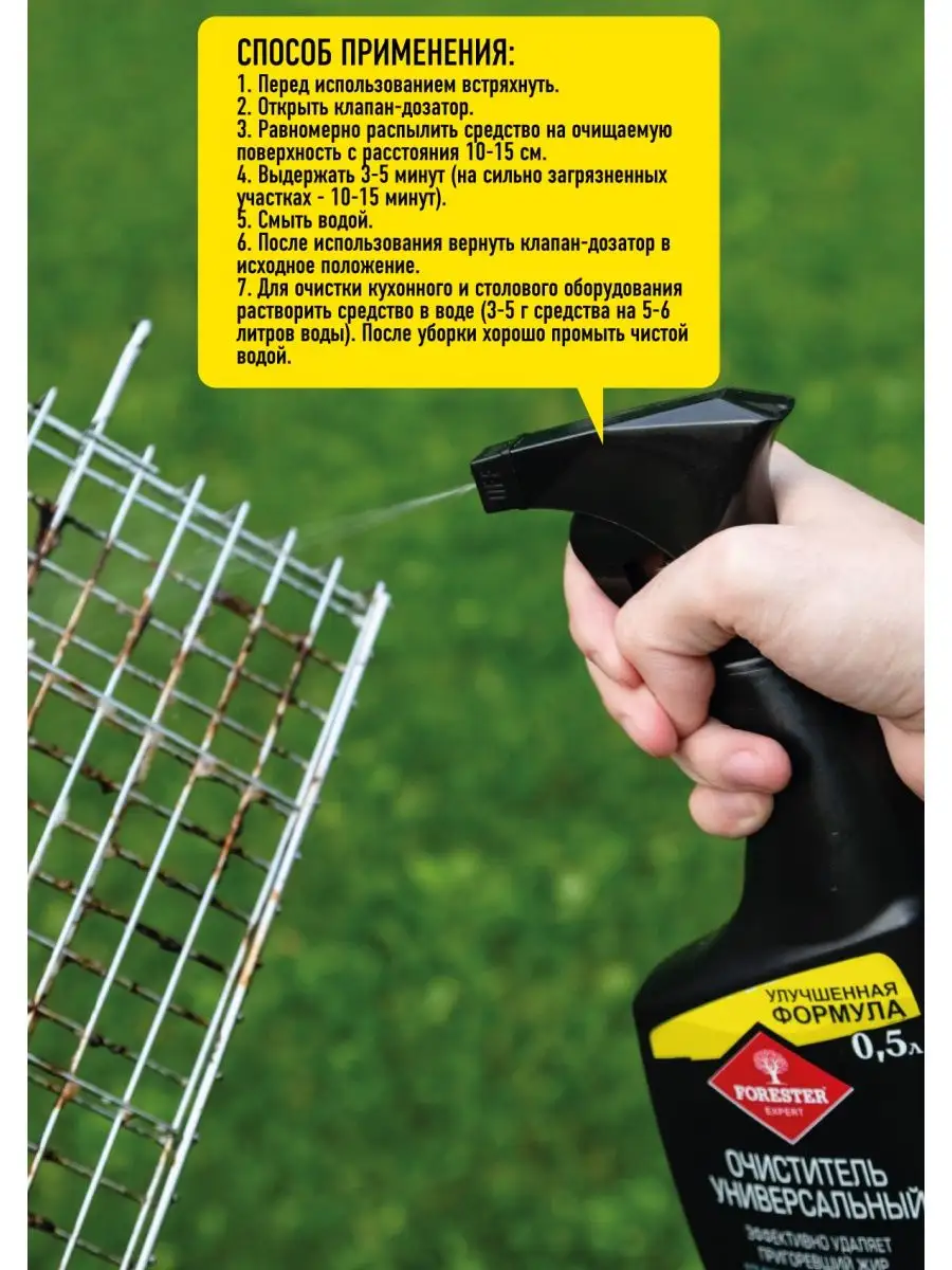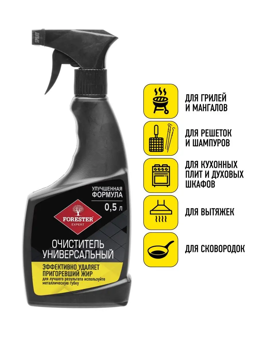 Описание: Универсальный очиститель Forester весьма актуальное средство в арсенале каждого любителя готовить кулинарные изыски на открытом огне. Благодаря универсальной мощной формуле данное средство без каких-либо усилий быстро устранит все типы загрязнений, включая пригар или копоть. При помощи специального дозатора-распылителя средство легко можно нанести на гриль решетки, шампуры и другие инструменты для готовки. После смывания не остается на предметах и не переносится на еду, а потому совершенно безопасен для здоровья. При работе с никелированными и хромированными поверхностями данное средство можно использовать для их полировки. Подсказка - отлично чистит вытяжки и духовки. Очиститель Forester (Форестер) позаботиться о ваших инструментах для пикника наилучшим образом!