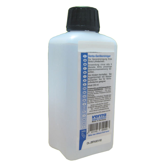 Очиститель для прибора VENTA был специально разработан для очистителей увлажнителей воздуха VENTA. Эта добавка представляет собой комплекс элементов, направленных на очистку прибора от налета кальция и других примесей из воды. Основным действующим веществом является лимонная кислота и ее производные. В процессе эксплуатации прибор Venta сильно загрязняется, причем не всегда грязь можно удалить просто промывая прибор под душем. Для этого и существует «Venta-Reiniger» (Очиститель для прибора), который удаляет любую грязь.