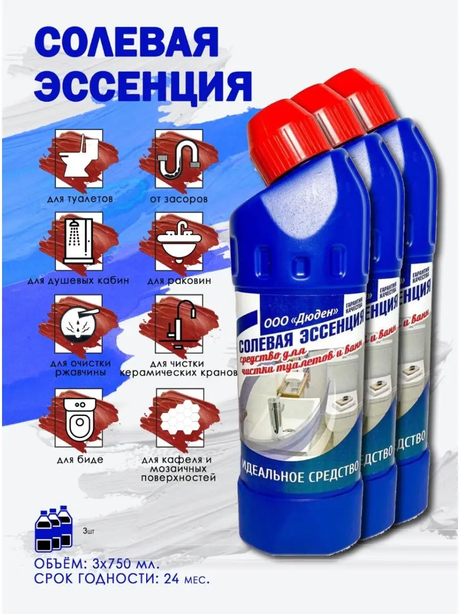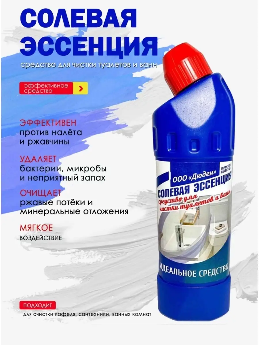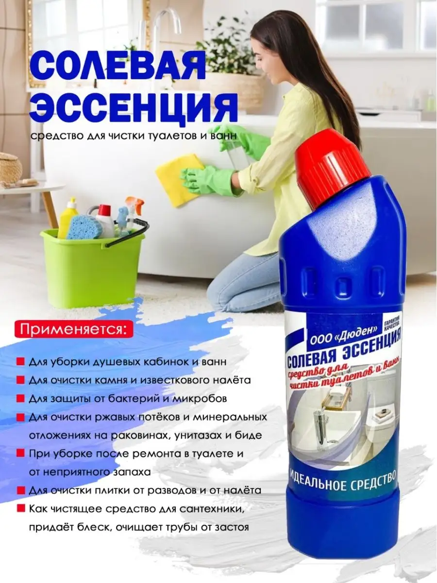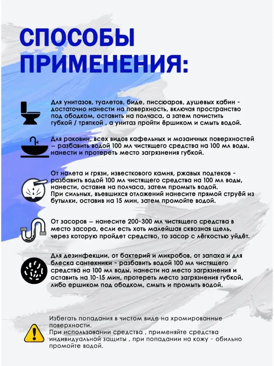 Описание: Средство для сантехники Вмоменте избавит Вас от долгой уборки и хлопот в ванной комнате и кухни. Очиститель для унитаза 0,75 л. применяется для чистки раковин, туалета, душевых кабин, а также биде, писсуаров, и всех видов кафельных и мозаичных поверхностей, придает блеск сантехнике. Средство для чистки туалетов и ванн используется в профессиональной деятельности, на предприятиях и производствах, т. к. содержит органическую и не органическую кислоту, благодаря которой с легкостью справляется с въевшемся налетом и грязью, известковым камнем, ржавыми подтеками. Чистящее средство подходит для уборки помещений после ремонта. Очиститель для унитаза можно использовать для дезинфекции от бактерий и микробов, достаточно нанести на поверхность, включая пространство под ободком, оставить на полчаса, а затем почистить унитаз ершиком и смыть водой. Жидкость для унитаза легко справляется с плохим запахом в ванной комнате и при чистки труб. Также подходит против ржавчины. СПОСОБЫ ПРИМЕНЕНИЯ: Очиститель для унитаза – Солевая эссенция (При сильных загрязнениях средство можно не разбавлять) 1. Для унитазов, туалетов, биде, писсуаров, душевых кабин - достаточно нанести на поверхность, включая пространство под ободком, оставить на полчаса, а затем почистить унитаз ершиком и смыть водой. 2. Для раковин, всех видов кафельных и мозаичных поверхностей – разбавить водой 100 мл чистящего средства на 100 мл воды, нанести и протереть место загрязнения губкой. 3. От налета и грязи, известкового камня, ржавых подтеков - разбавить водой 100 мл чистящего средства на 100 мл воды, нанести, оставив на полчаса, затем промыть водой. При сильных, въевшихся отложений нанесите прямой струей из бутылки, оставив на 15 мин, затем промойте водой. 4. От засоров – нанесите 200-300 мл чистящего средства в место засора, если есть хоть малейшая сквозная щель, через которую пройдет средство, то засор с лёгкостью уйдёт. 5. Для дезинфекции, от бактерий и микробов, от запаха и для блеска сантехники - разбавить водой 100 мл чистящего средства на 100 мл воды, нанести на место загрязнения и оставить на 10-15 мин, протереть место загрязнения губкой, либо ершиком под ободком, смыть и промыть водой. Избегать попадания на хромированные поверхности! Теги: Универсальное чистящее средство от известкового налета ржавчины солевых отложений для чистки унитазов кафеля сантехники Солевая Эссенция 750 мл. Средства кислотное для уборки от ВМоменте Чистящее средство для ванной кухни туалета (чистящее средство для унитаза туалета) фаянсовых изделий кафеля от известкового налета потеков ржавчины солевых отложений Универсальное чистящее средство для уборки подходит для чистки фаянсовых изделий на кухне и ванной комнаты. Способствует устранению неприятного запаха, убивает микробы.
