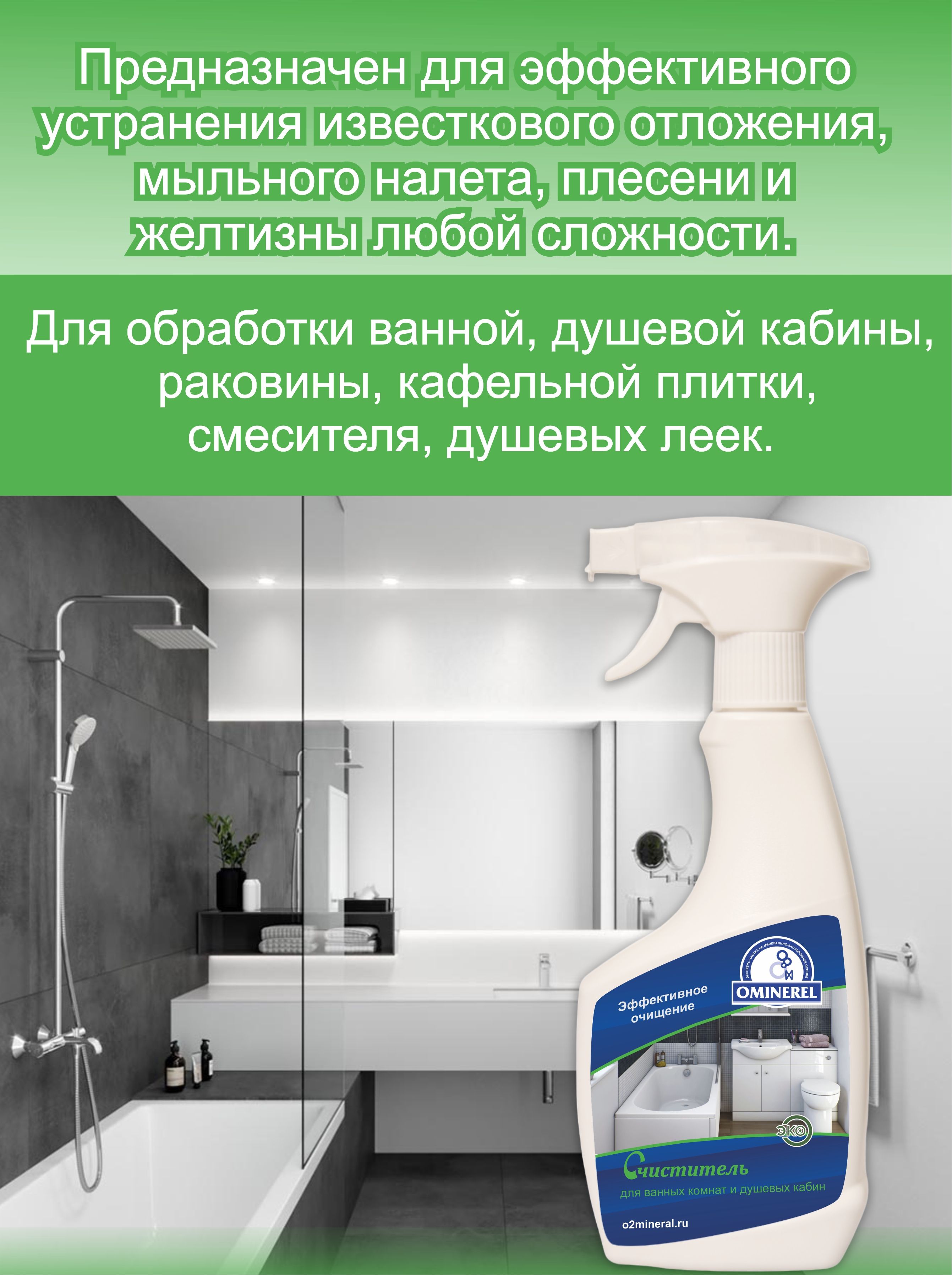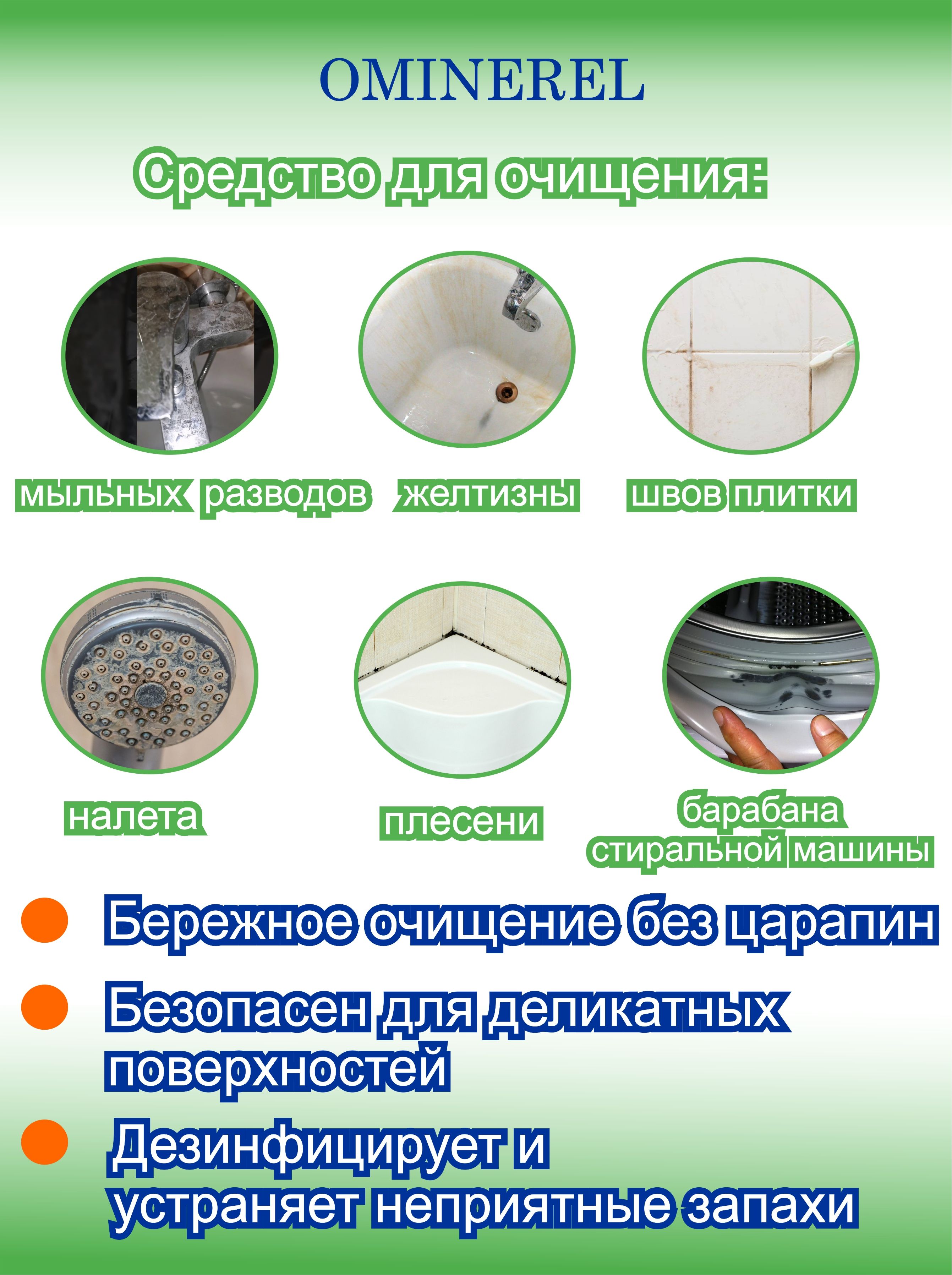 очиститель OMINEREL эффективно удаляет известковый налет, ржавчину, мыльные разводы.