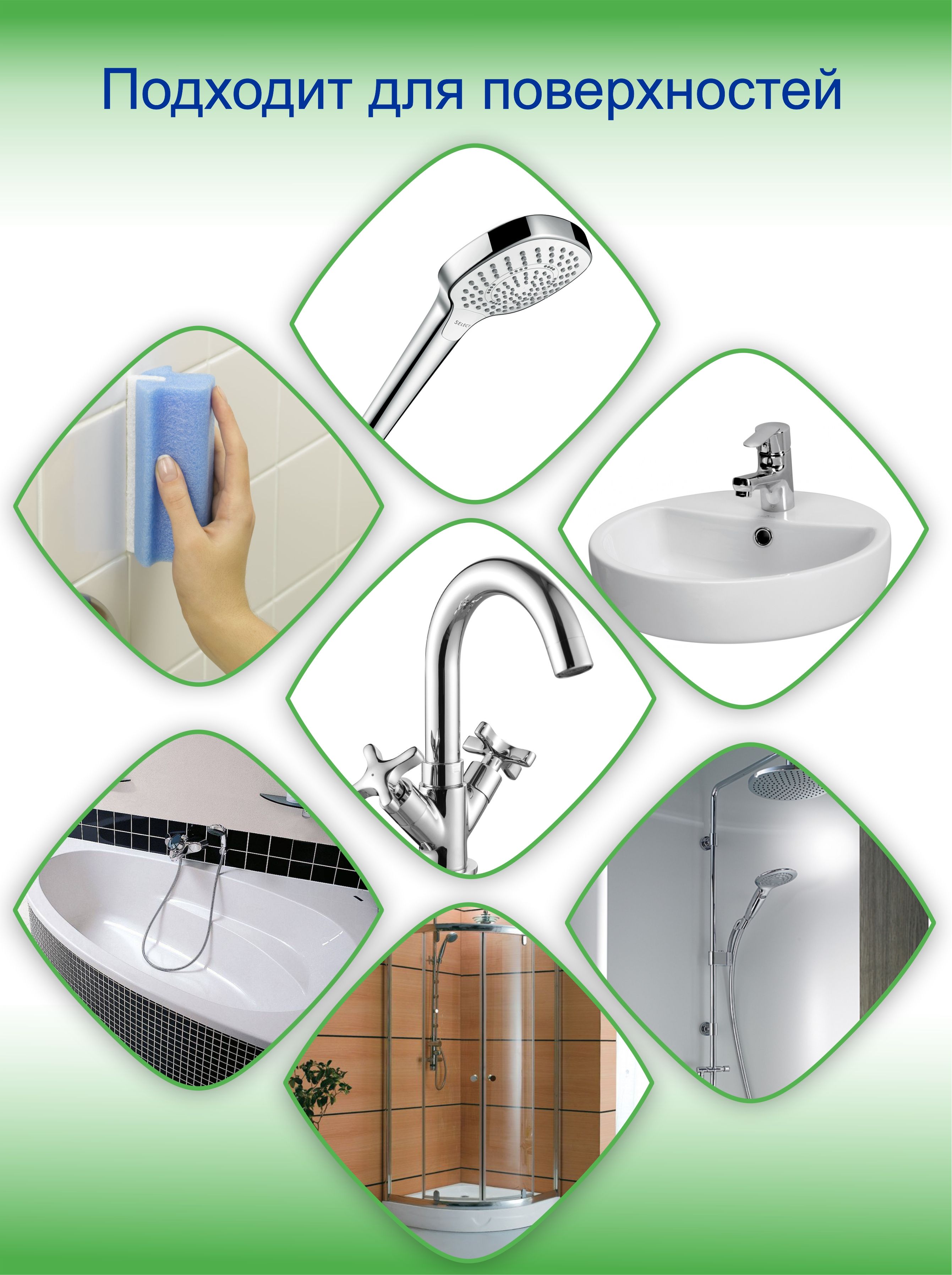 Назначение чистящего средства для ванной и туалета: Для душевой кабины, Для акриловых поверхностей, Для сантехники, Для унитаза