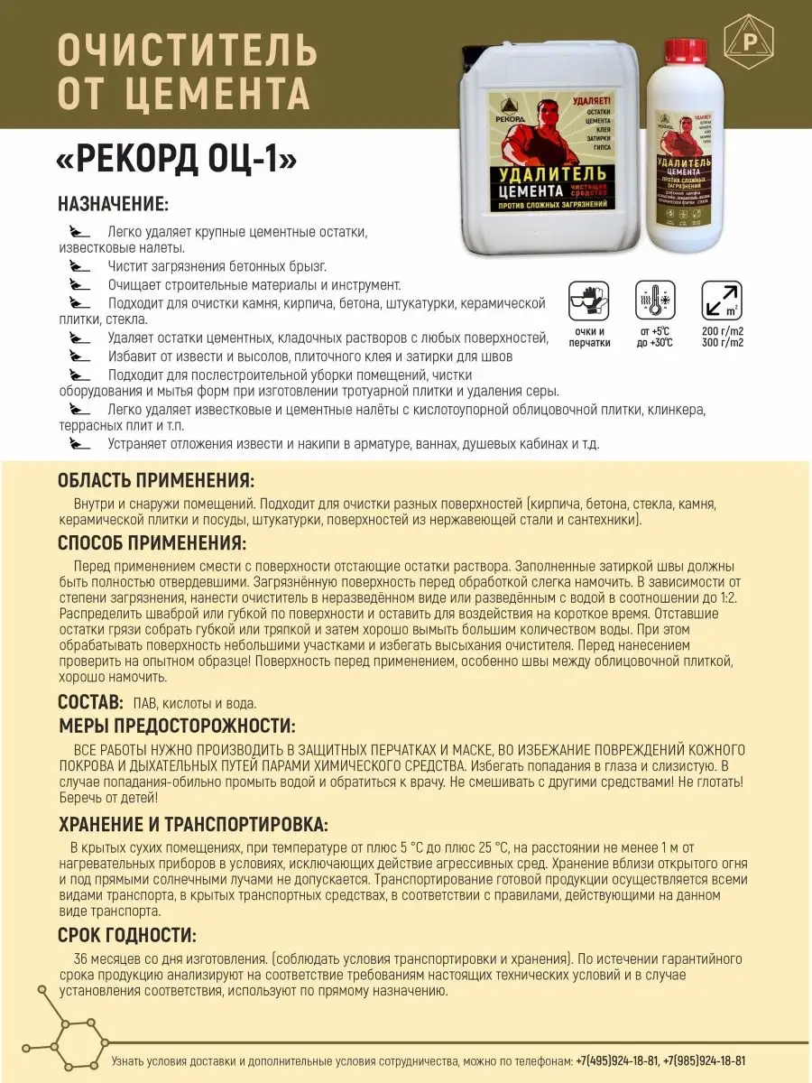 Эффект средства Удаляет цемент; Очищает от цемента; Очистка поверхностей от цемента