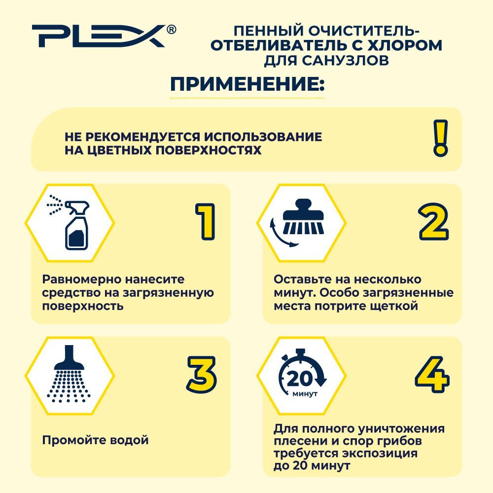 Для решения данной задачи необходимо выбрать лучшее средство для чистки ванны, раковины, унитаза, кафеля и других поверхностей, контактирующих с водой. Для достижения идеального результата с наименьшими затратами сил при уборке рекомендуем воспользоваться моющими средствами PLEX. Разработанные лучшими специалистами, они отлично справляются с органическими и минеральными загрязнениями на внешних и внутренних поверхностях. Средства PLEX для чистки сантехники и кафеля помогут избавиться от всех этих проблем без лишних усилий. Бытовая химия PLEX для эффективной очистки и дезинфекции поверхности душевых кабин, ванн, кафельной плитки – убивает микробы и плесень, удаляет органические загрязнения. Обладает мощным отбеливающим эффектом. Быстро дает видимый результат. Не имеет резкого запаха.БЫТОВАЯ ХИМИЯ PLEXГенеральная уборка ванной комнаты и санузла – самая неприятная часть домашнего клининга, поскольку ржавчина, известковый налет и желтые пятна (особенно застарелые), трудно поддаются удалению.