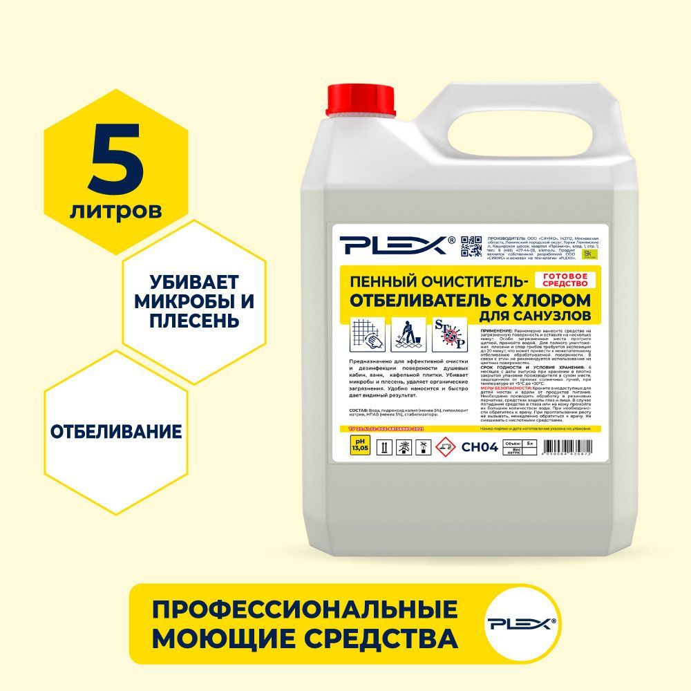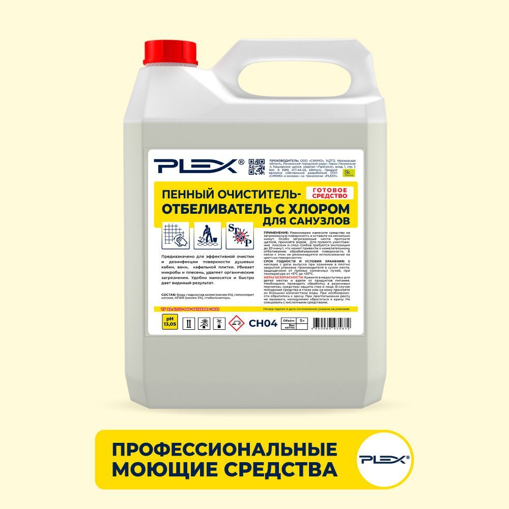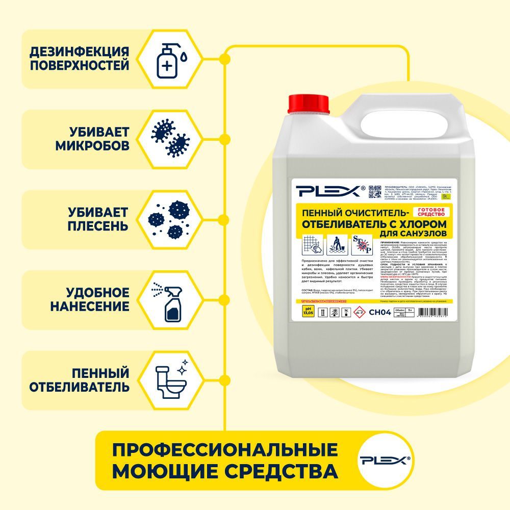 Универсальные высокоэффективные чистящие средства PLEX применяются для различных поверхностей, в том числе часто находящихся в контакте с водой. Подходит для бережной чистки, удаления стойких загрязнений и дезинфекции. Придает блеск, сохраняя эффект на несколько дней.ОЧИСТИТЕЛЬ-ОТБЕЛИВАТЕЛЬ ДЛЯ САНУЗЛОВ PLEX ПЕННЫЙ, С ХЛОРОМ