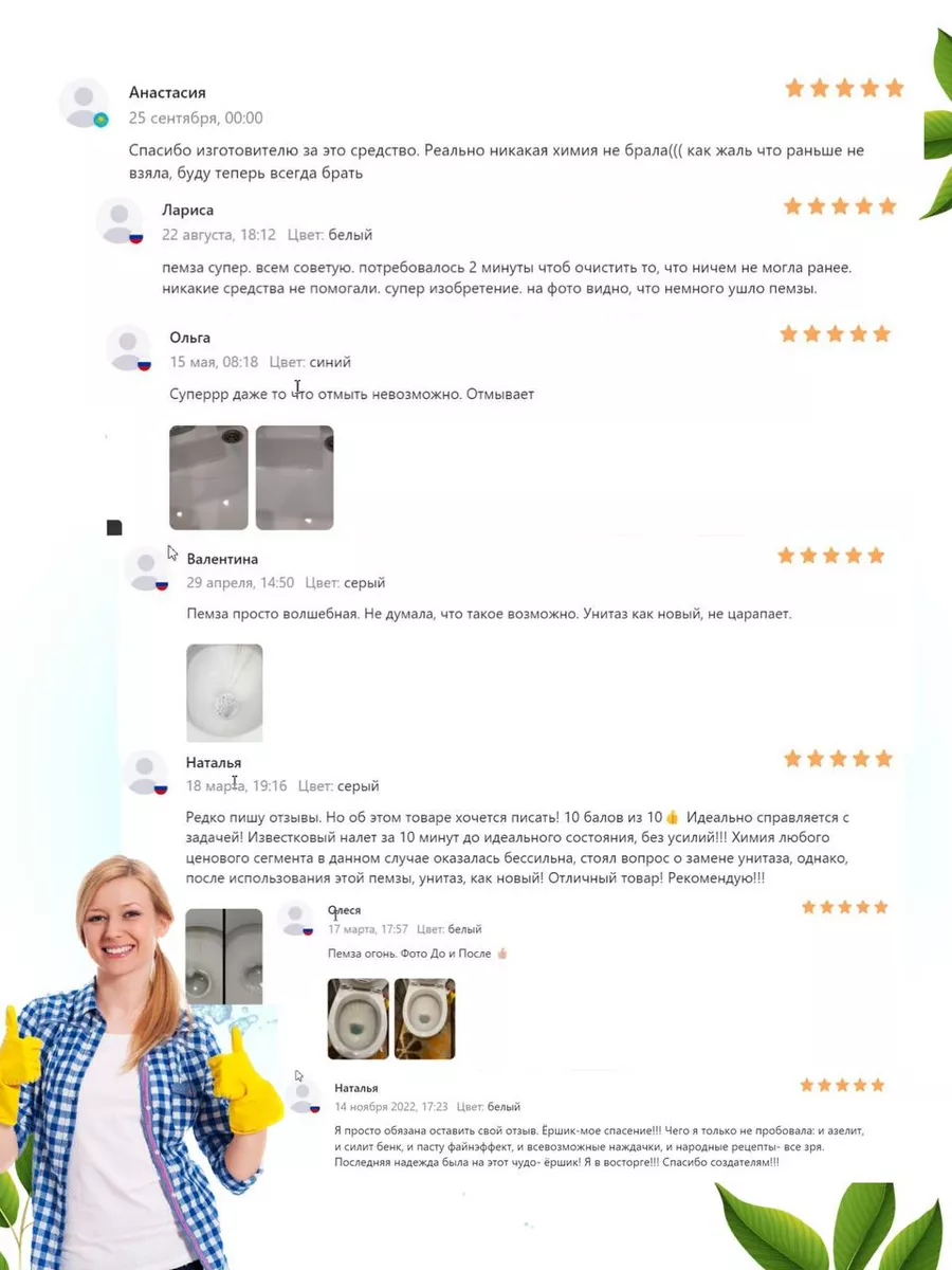 Описание: Очиститель пемза для уборки дома – это самое лучшее натуральное чистящее средство от ржавчины и известкового налета, которое поможет вам в чистке ванны и туалета, бассейнов и душевых кабин, любой сантехники и керамической плитки имеющих прочную поверхность. Такой ершик пемза для ванных комнат и туалетов отлично удалит любые загрязнения с поверхности кафеля, унитазов, раковин, моек и прочей сантехники и бытовых предметов. Это универсальное средство для уборки, которое отлично подходит не только для туалета и ванных комнат, но также он будет полезен и на кухне, для чистки плитки как антижир, кастрюль сковород противней, а также мангала гриля барбекю шампуров решёток и прочей утвари. Этот супер очиститель легко справляется с налетом ржавчины, солевыми отложениями и плесенью, нагаром и копотью, удалит пригоревшие частички жира и любые стойкие загрязнения. Результат после применения этого средства от налета вас обязательно порадует. Такой очиститель для унитаза, просто уникальный эко продукт, он не имеет запаха, не содержит хлора и прочих агрессивных химических веществ, абсолютно безопасен для использования и заменит вам множество хозяйственных товаров и бытовой химии. Это экологичное средство не впитывает запахи, жир и грязь, очень проста в применении, необходимо только смочить пемзу и очищаемую поверхность водой и потереть загрязнённый участок. Это средство для унитаза от известкового камня и ржавчины - очень мощное чистящее средство, поэтому его не стоит использовать на легко травмируемых поверхностях, таких например, как: акрил, пластмасс, стеклокерамика, хромированные и антипригарные поверхности и т.п. С этим средством от ржавчины и мочевого камня, уборка санузлов в доме станет намного легче и эффективнее. Если ни одно чистящее средство для сантехники, не принесло Вам нужный результат, то можете с уверенностью брать этот очиститель от налета. Мы уверенны, Вы останетесь довольны полученным результатом. Сложные загрязнения теперь перестанут быть вашей проблемой!