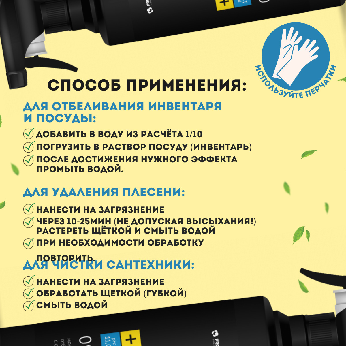 Описание: Универсальное чистящее средство с хлором - это способ идеальной чистки и отбеливания различных поверхностей. Эффективно работает как пятновыводитель против пищевых, бытовых и пигментированных загрязнений, а также желтизны, следов плесени и никотиновых смол на керамических, каменных, пластиковых и деревянных поверхностях, на нержавеющей стали. Оно не только эффективно удаляет самые стойкие пятна, но и обеспечивает глубокую и тщательную санитарную обработку. Благодаря своему освежающему запаху и дезинфицирующим свойствам, этот моющий и отбеливающий состав идеально подходит для использования в кухнях, где он справляется и уничтожает различные патогенные микроорганизмы, бактерии в т.ч. плесень и борется с неприятными въедливыми запахами, такими как – рыбный запах или гнилостный. Это уникальное средство легко справляется с очисткой сантехники в ванной комнате, отбеливанием посуды и борьбой с налетом на туалете. Оно также эффективно удаляет пятна на поверхностях и обеспечивает безупречную чистоту. Легко смывается Благодаря добавке хлора, жидкость является идеальным выбором для очистки различных поверхностей дома от пола до потолка. Оно помогает устранить ржавчину с труб, очищает поверхности кухонных плит и кранов, а также идеально подходит для очистки эмалированных ванн и душевых кабин. Способ применения: испытать на незаметном участке. Температурный режим мойки 20-40°С. 1. Для отбеливания инвентаря и посуды: добавить в воду из расчёта 1/10 (100мл+900мл воды=1л 10%-раствора), погрузить в раствор посуду (инвентарь), после достижения нужного эффекта промыть водой. 2. Для общей уборки и уничтожения запахов: нанести раствор на поверхность и смыть водой. Максимальное разбавление: → 1/100 (10мл+990мл воды=1л 1%-раствора) для полов; → 1/20 (50мл+950мл воды=1л 5%-раствора) для др. поверхностей. 3. Для удаления плесени: использовать концентрат, нанести на загрязнение, через 10-25мин (не допуская высыхания!) растереть щёткой и смыть водой. При необходимости обработку повторить. 4. Для чистки сантехники: использовать концентрат, нанести на загрязнение, обработать щёткой (губкой) и смыть водой. Примечание: оптимальную концентрацию определять по виду и степени загрязнения, жёсткости и температуре воды, типу поверхности и др. условиям мойки.10%-раствора), погрузить в раствор посуду (инвентарь), после достижения нужного эффекта промыть водой. 2. Для общей уборки и уничтожения запахов: нанести раствор на поверхность и смыть водой. Максимальное разбавление: → 1/100 (10мл+990мл воды=1л 1%-раствора) для полов; → 1/20 (50мл+950мл воды=1л 5%-раствора) для др. поверхностей. 3. Для удаления плесени: использовать концентрат, нанести на загрязнение, через 10-25мин (не допуская высыхания!) растереть щёткой и смыть водой. При необходимости обработку повторить. 4. Для чистки сантехники: использовать концентрат, нанести на загрязнение, обработать щёткой (губкой) и смыть водой. Примечание: оптимальную концентрацию определять по виду и степени загрязнения, жёсткости и температуре воды, типу поверхности и др. условиям мойки.