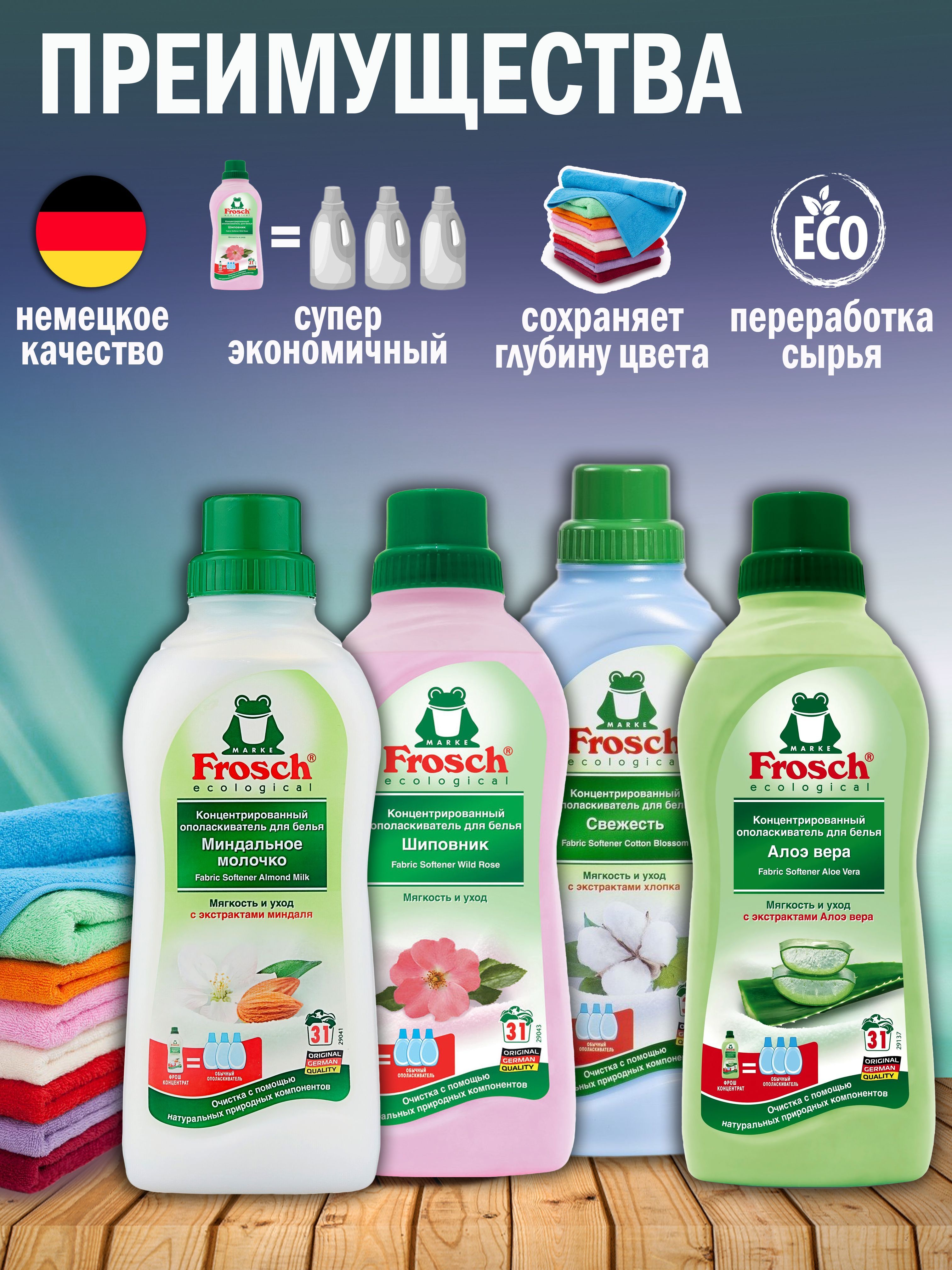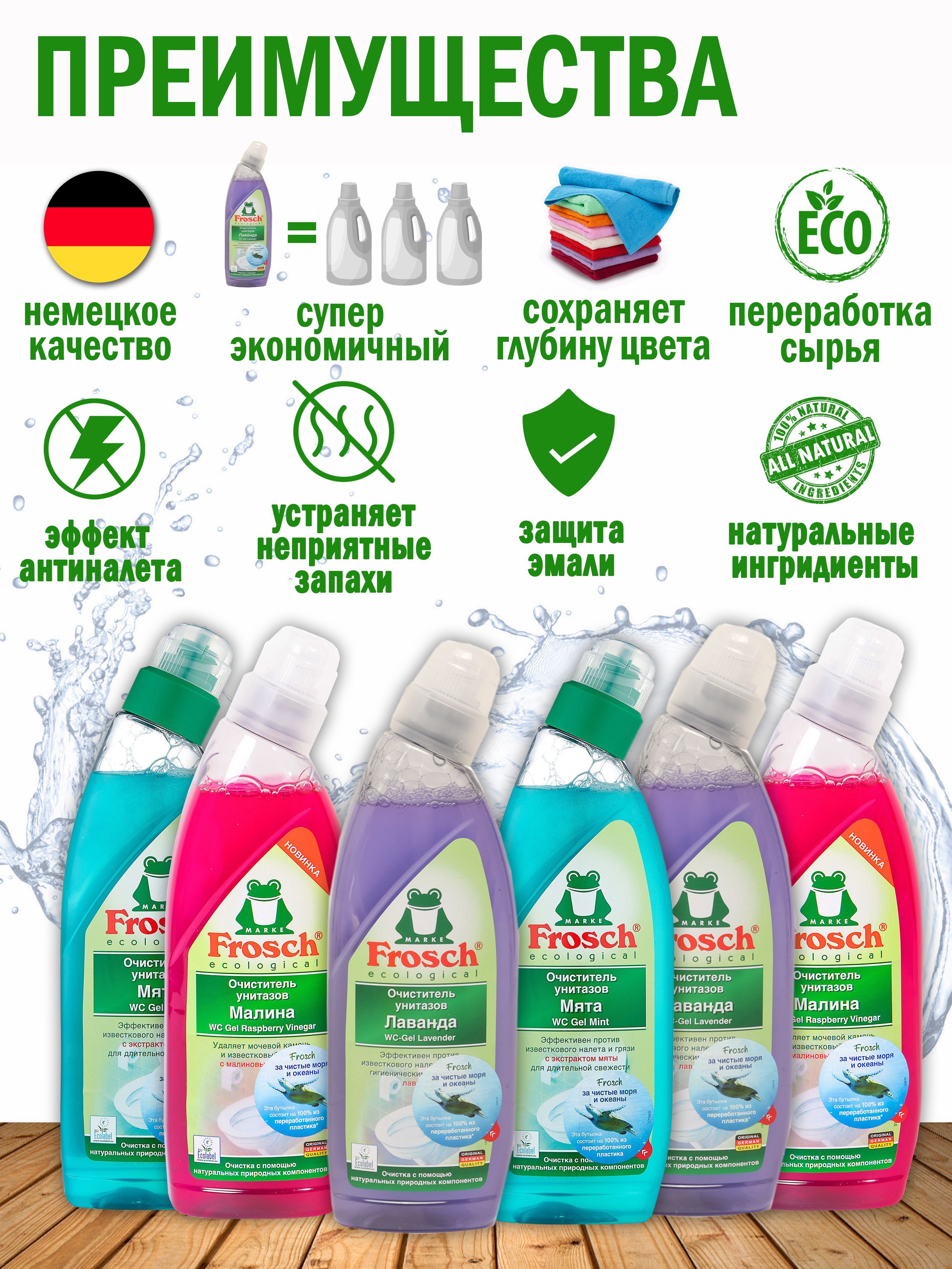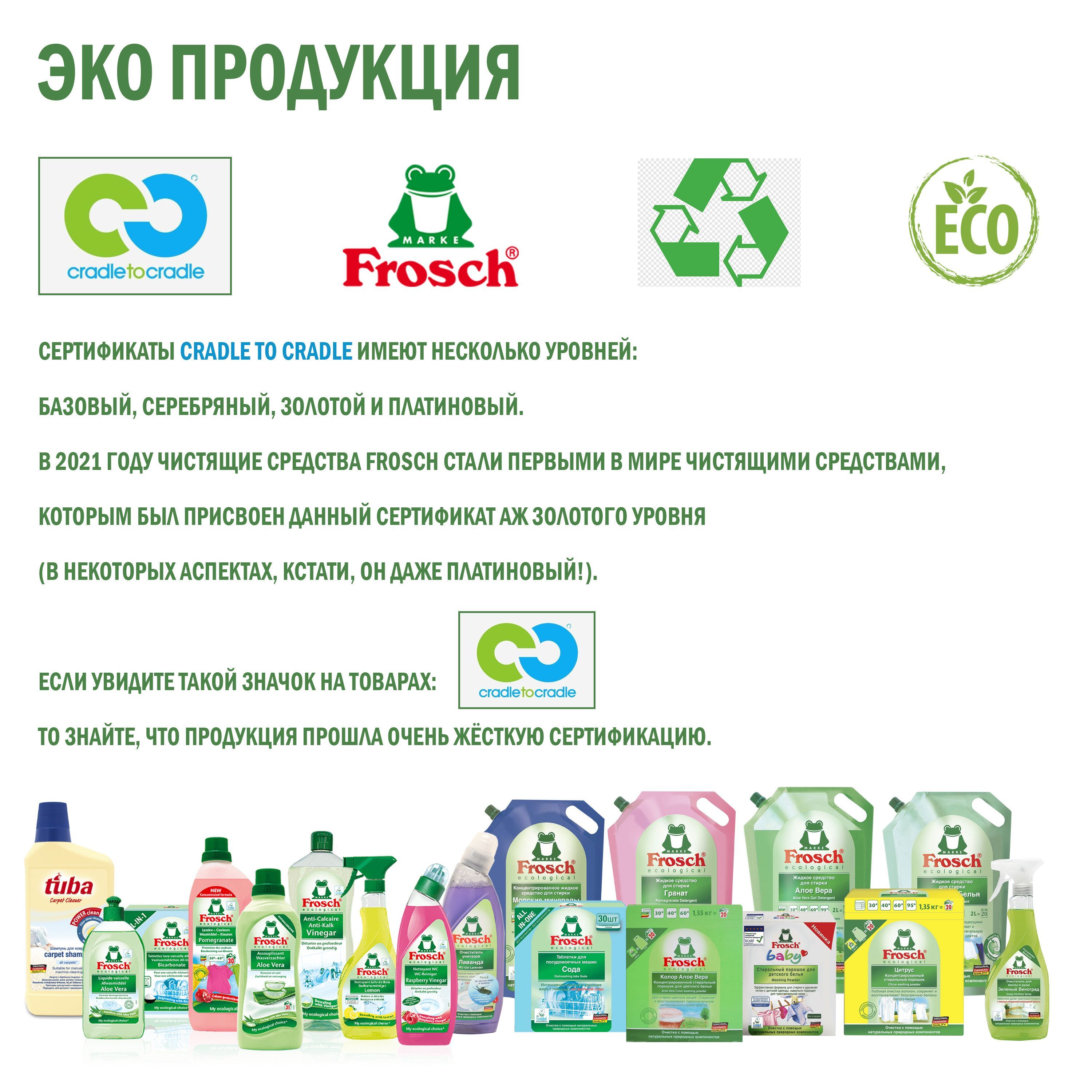 С заботой о самых маленькихКомпания Frosch производит безопасные средства, не содержит фосфатов, хлора, формальдегидов и других веществ, негативно влияющих на здоровье человека.С заботой об экологииПродукция создана на основе натуральных природных компонентов, которые эффективно справляются со своей задачей, безвредны для окружающей среды, так как полностью разлагаются в почве.С заботой о самом важномПродукция компании Frosch имеет ряд преимуществ: