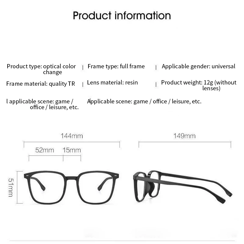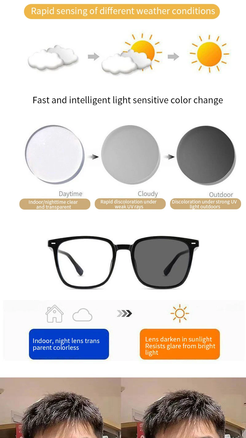 Применимые случаи: фотохромные очки для близорукости подходят для всех типов кожи, форм лица и внешнего вида. Лучше всего подходит для работы, вождения, учебы и активного отдыха