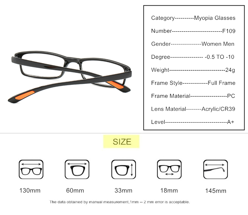 Очки для близорукости Сфера по рецепту от -0,5 до -10 Женщины Мужчины Близорукие очки обесцвеченные или блокирующие синий свет астигматизм Настраиваемые F109