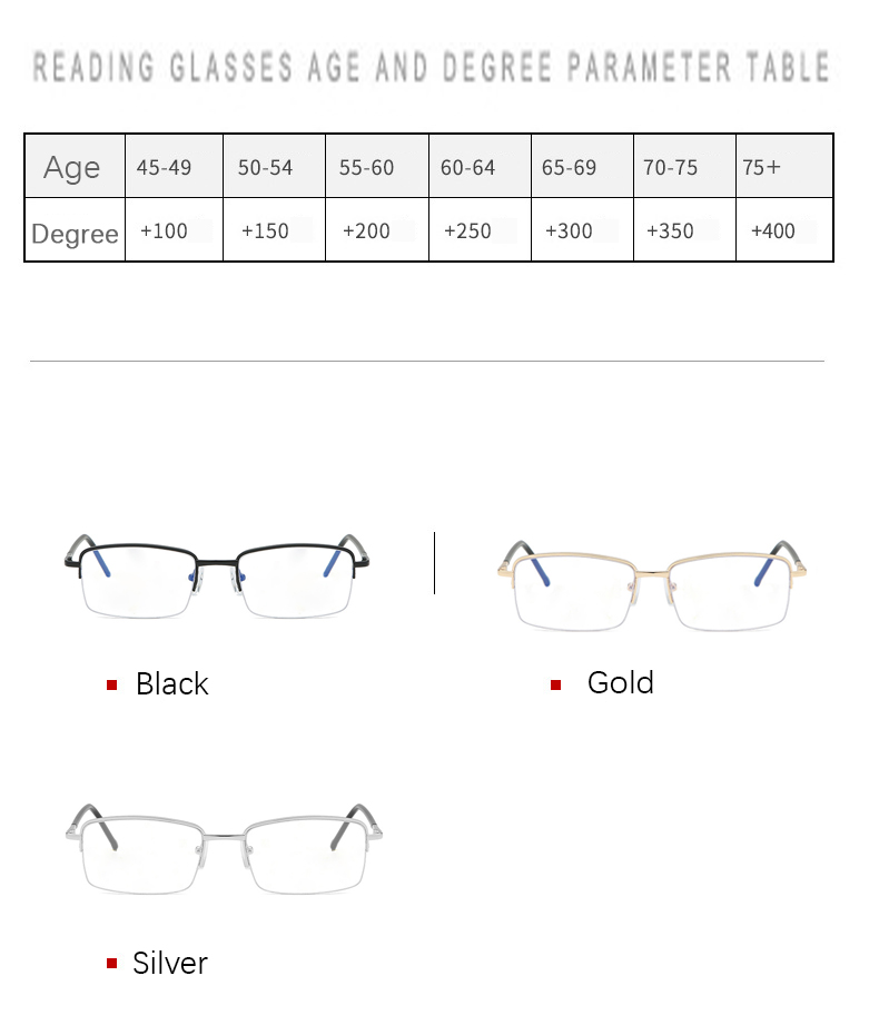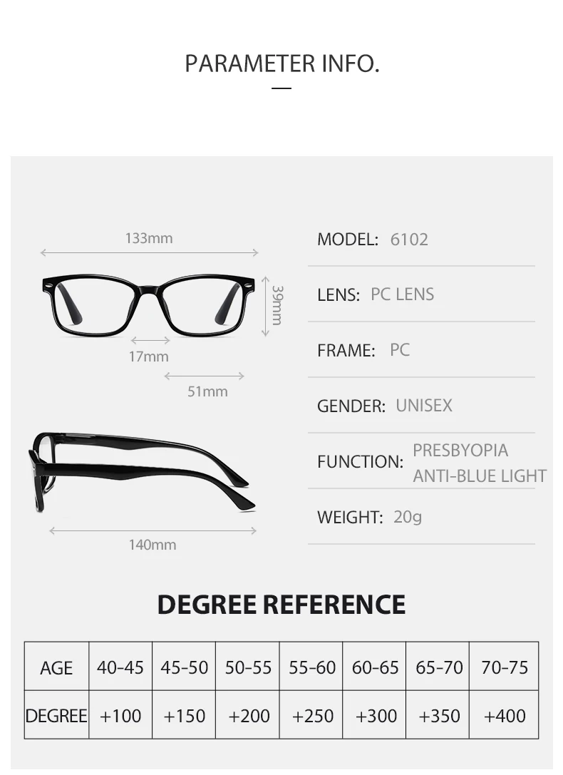 Frame Material: PLASTIC Prescription: 1.0 1.5 2.0 2.5 3.0 3.5 4.0