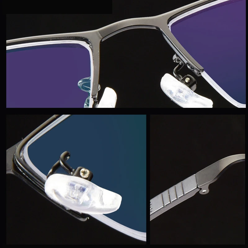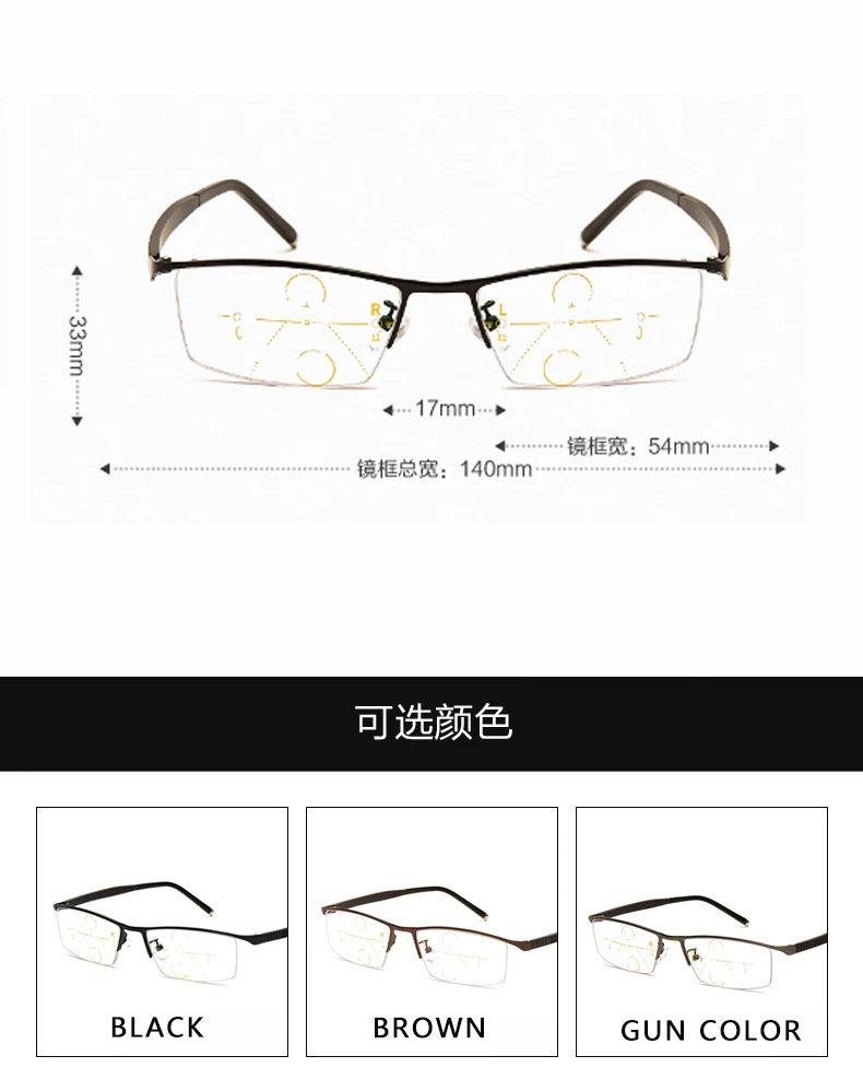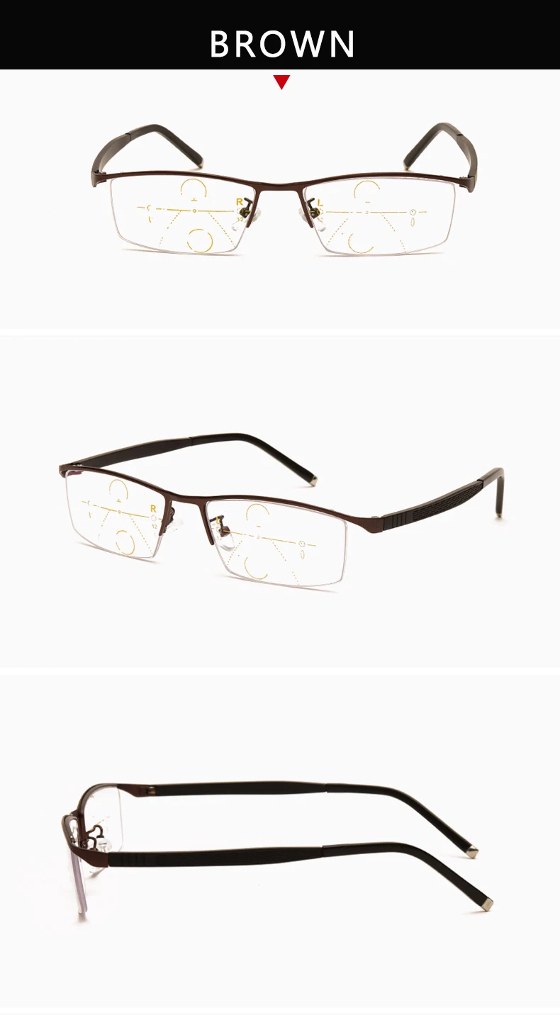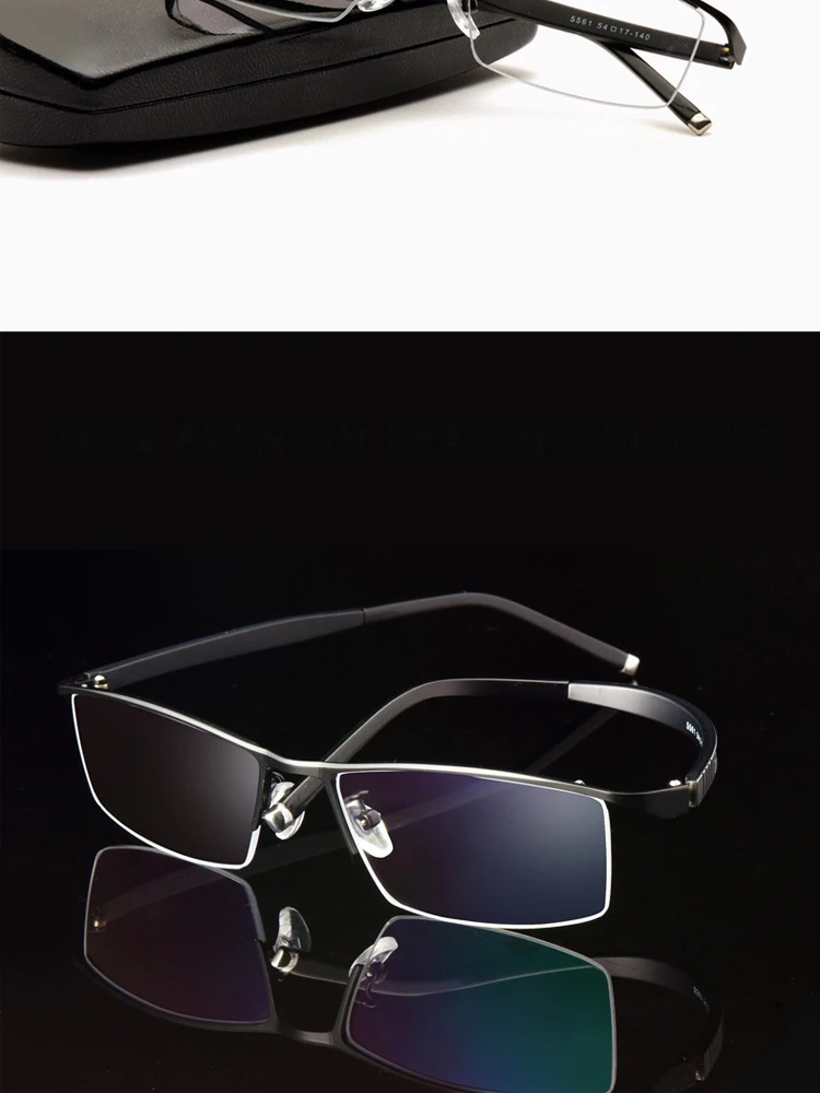 Описание функции: 1. Передняя часть линзы подвешена 2. Полурамка 3. Материал из нержавеющей стали 4. Обычные очки для чтения 5. Многофокусный анти-синий светильник 6. Фотохромные очки для чтения