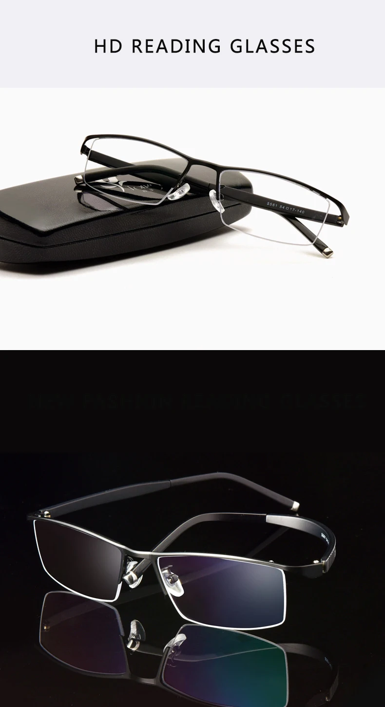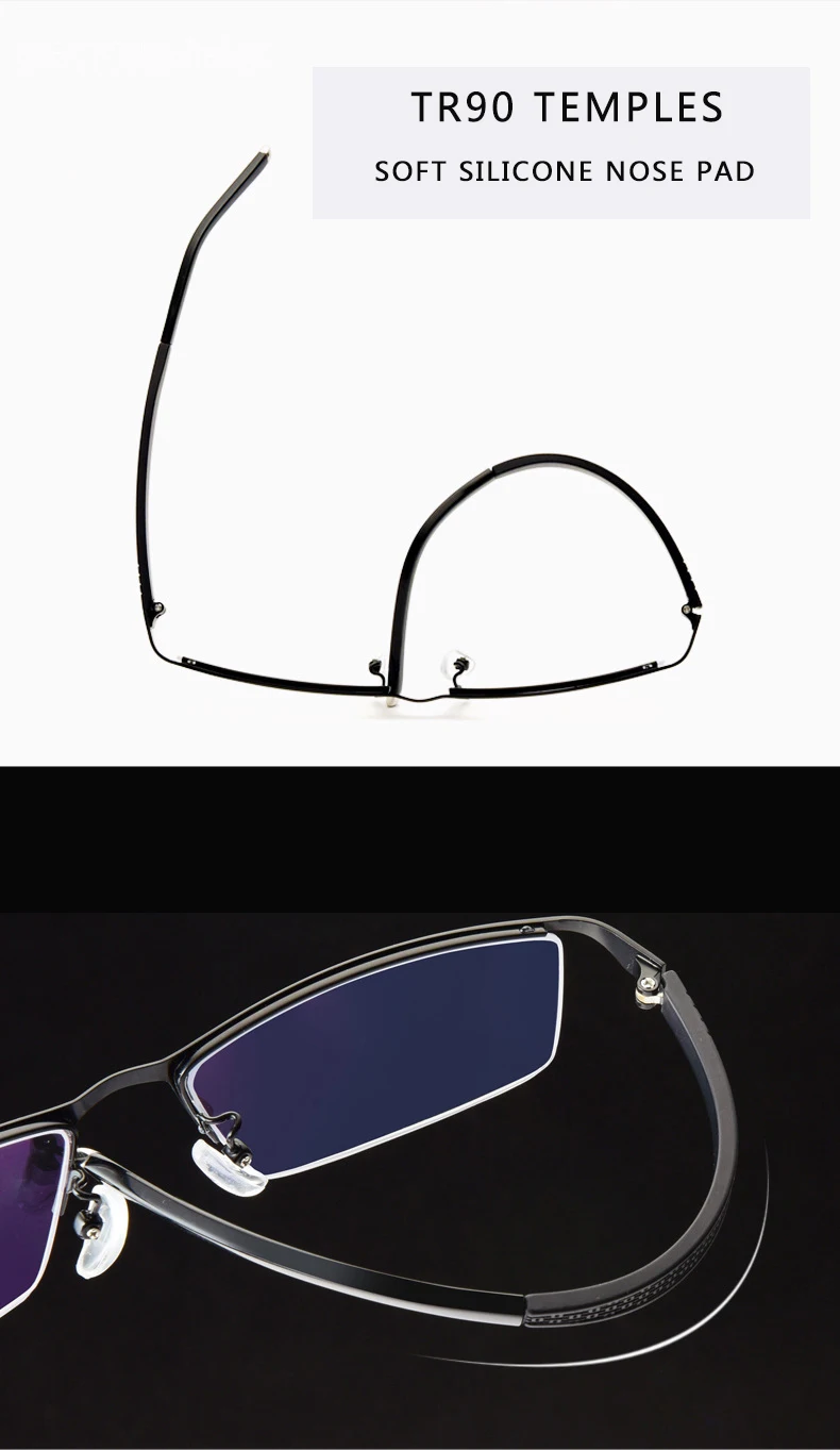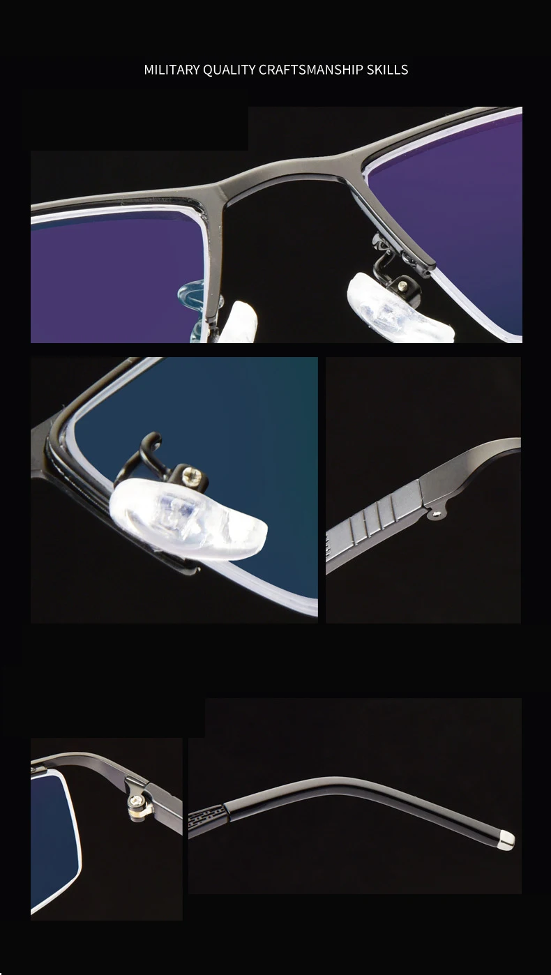 Описание функции: 1. Передняя часть линзы подвешена 2. Полурамка 3. Материал из нержавеющей стали 4. Обычные очки для чтения 5. Многофокусный анти-синий светильник 6. Фотохромные очки для чтения