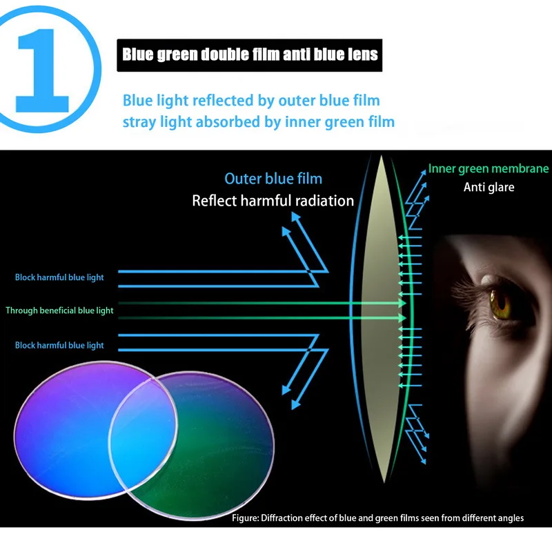 Эти очки эффективно блокируют 90% синих лучей, уменьшают напряжение глаз и другие визуальные синдромы (размытые видения, выпуклость, головная боль, сухость глаз, отклонение зрения и т. д.).