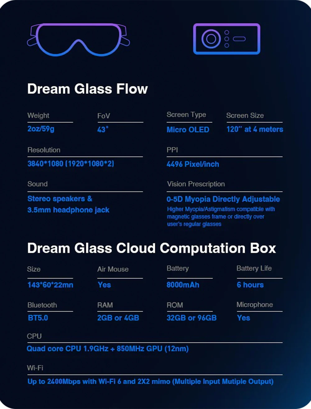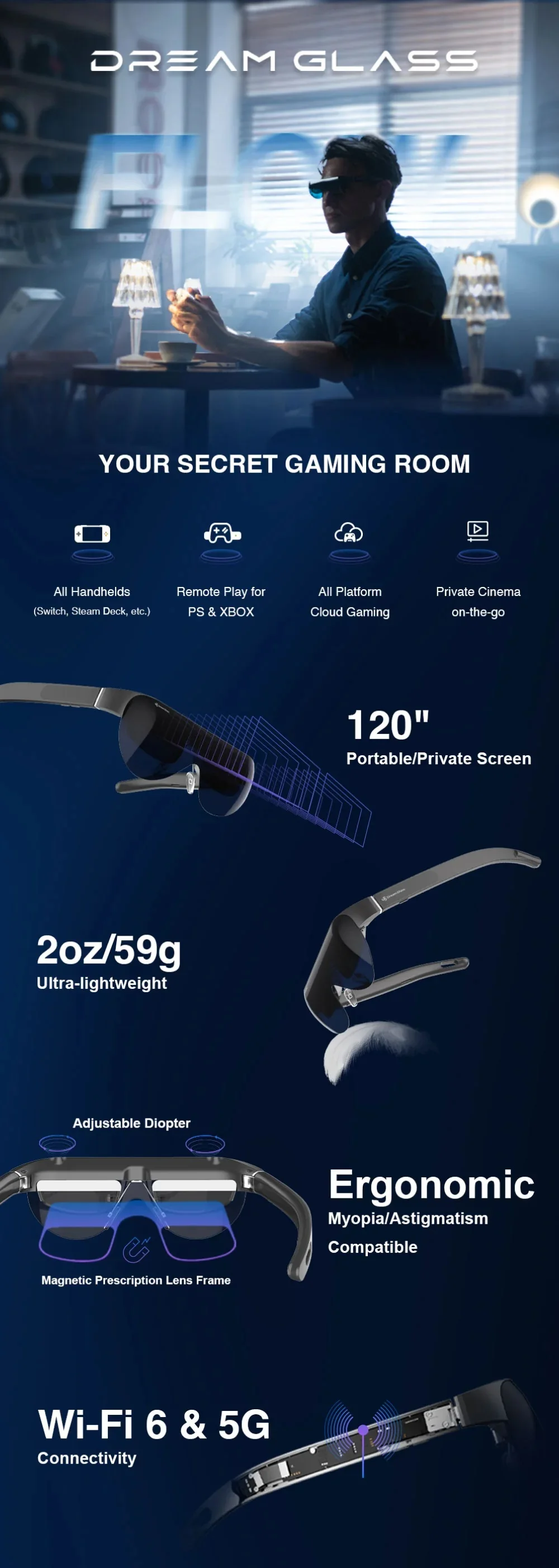 Dream Glass Flow-это Дополненная реальность (AR) glass es для игр и потокового видео и обеспечивает превосходный удобный игровой опыт.