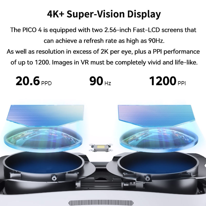PICO 4 оснащен двумя 2,56-дюймовыми Fast-LCD экранами, которые могут достигать частоты обновления до 90 Гц.