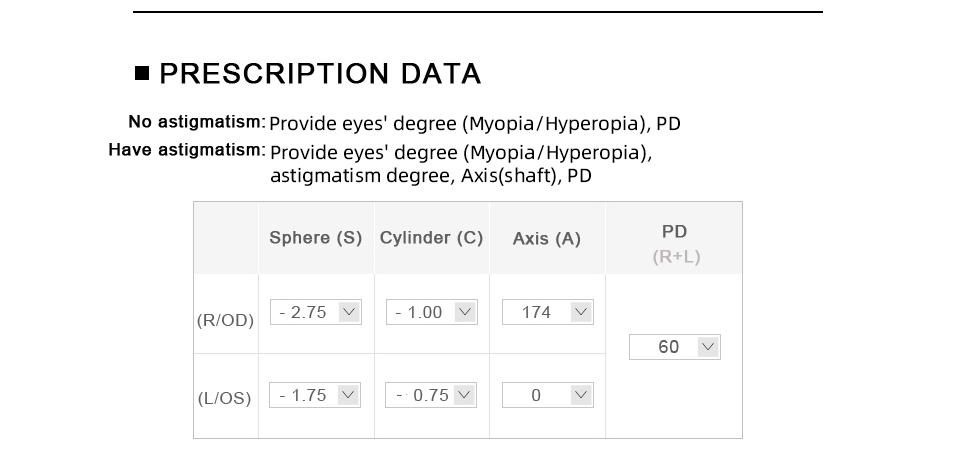 У астигматизма: степень правого глаза (-6,0 ~ + 6,0), астигматизм правого глаза (-2,0 ~ + 2,0), ось астигматизма правого глаза (0 ~ 180), степень левого глаза (-6,0 ~ + 6,0), астигматизм левого глаза (-2,0 ~ + 2,0), ось левого астигматизма (0 ~ 180), Расстояние зрачка (40 ~ 80)