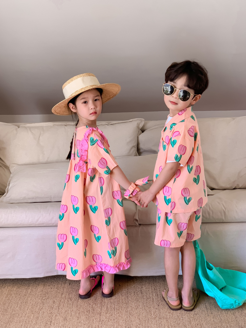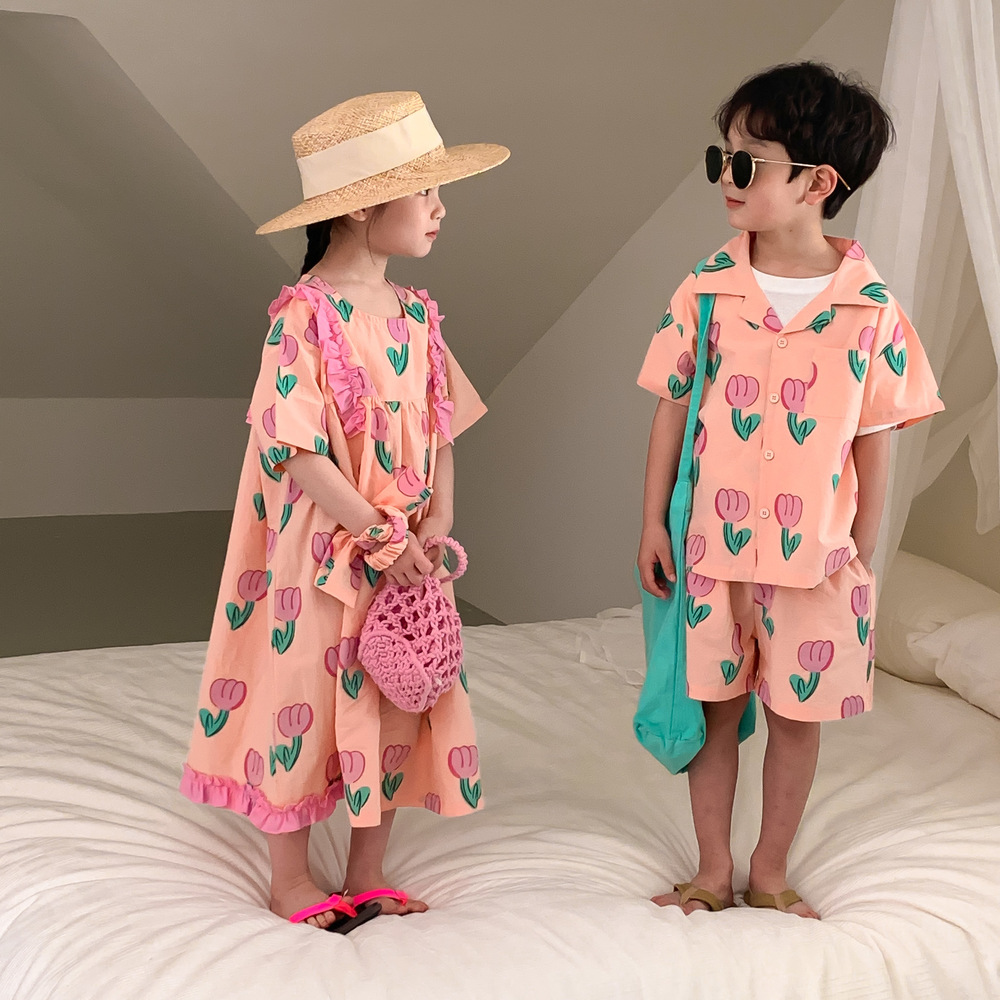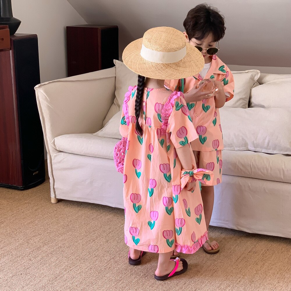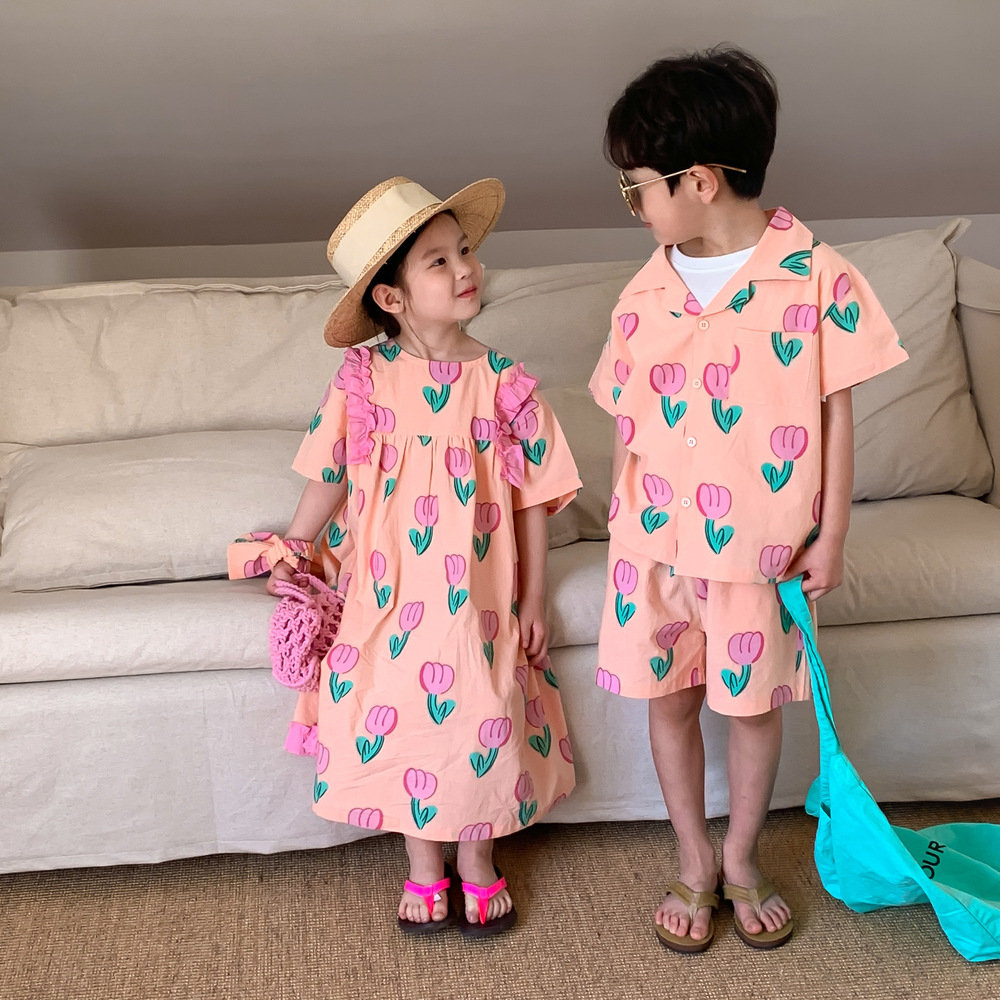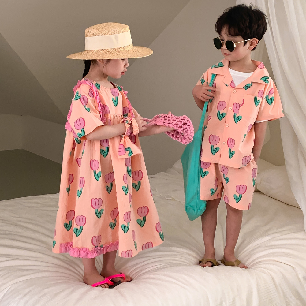 Одежда Brother and Sister 2023, летнее кружевное платье с принтом тюльпана или костюм из двух предметов для мальчиков, рубашка + шорты
