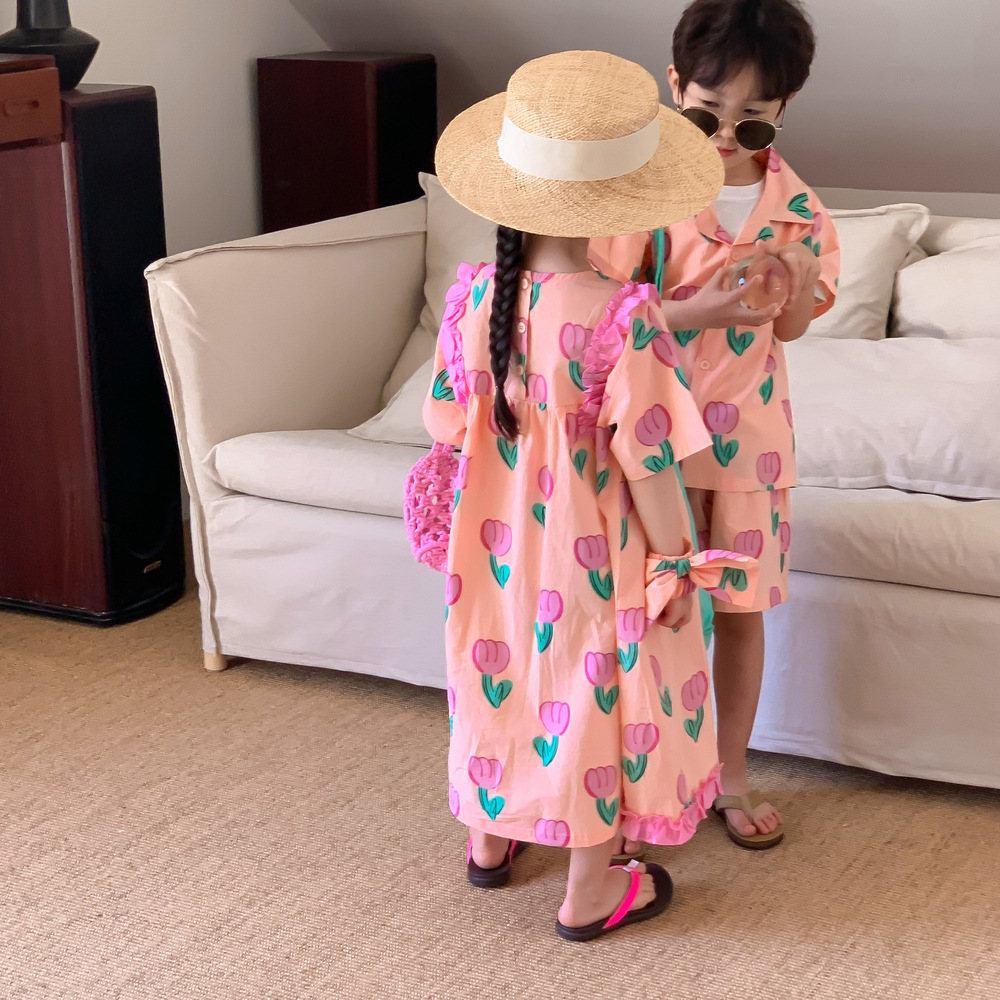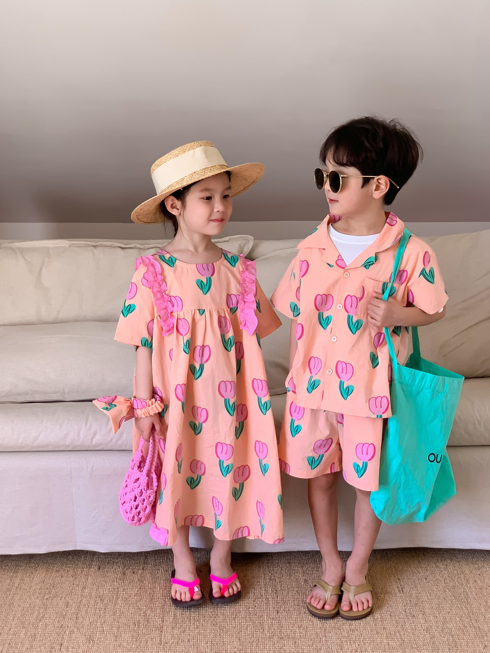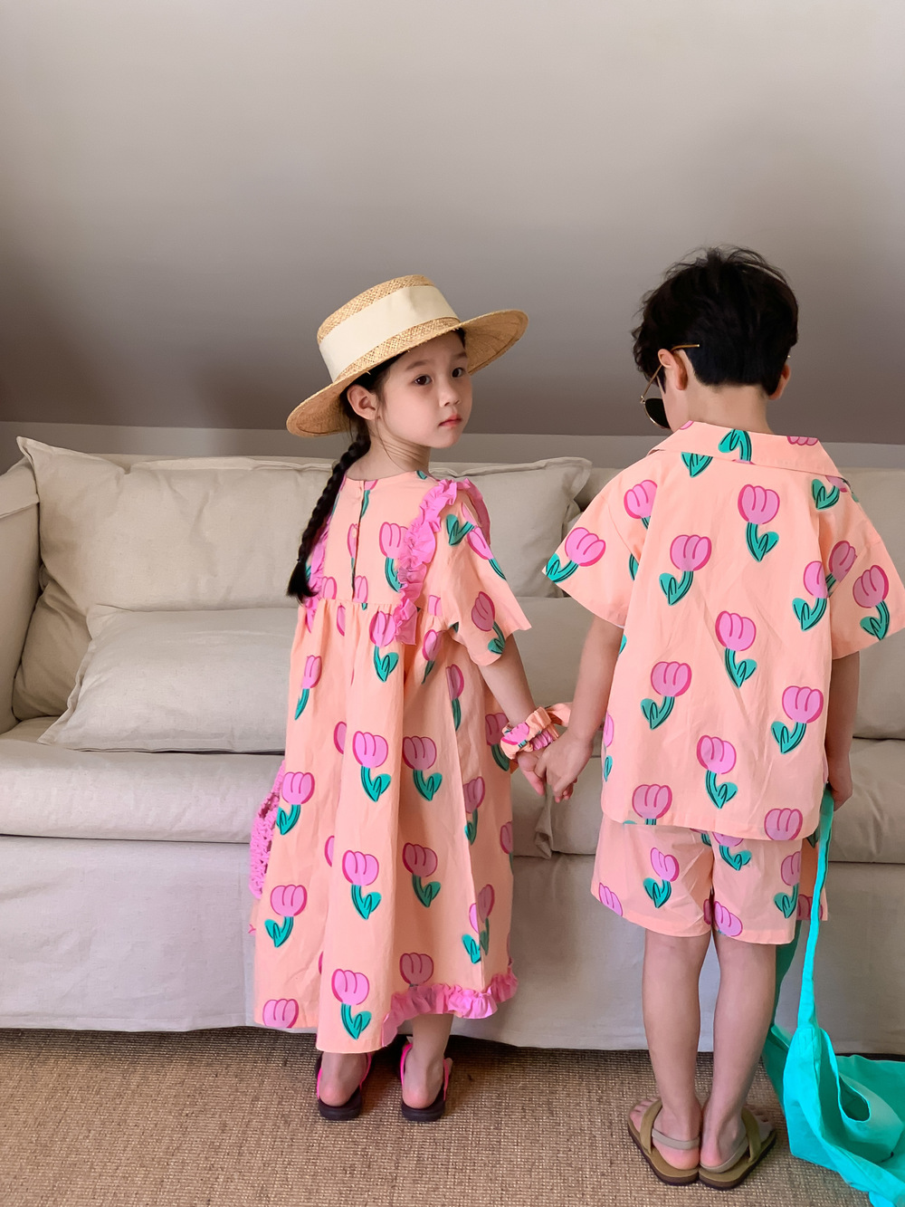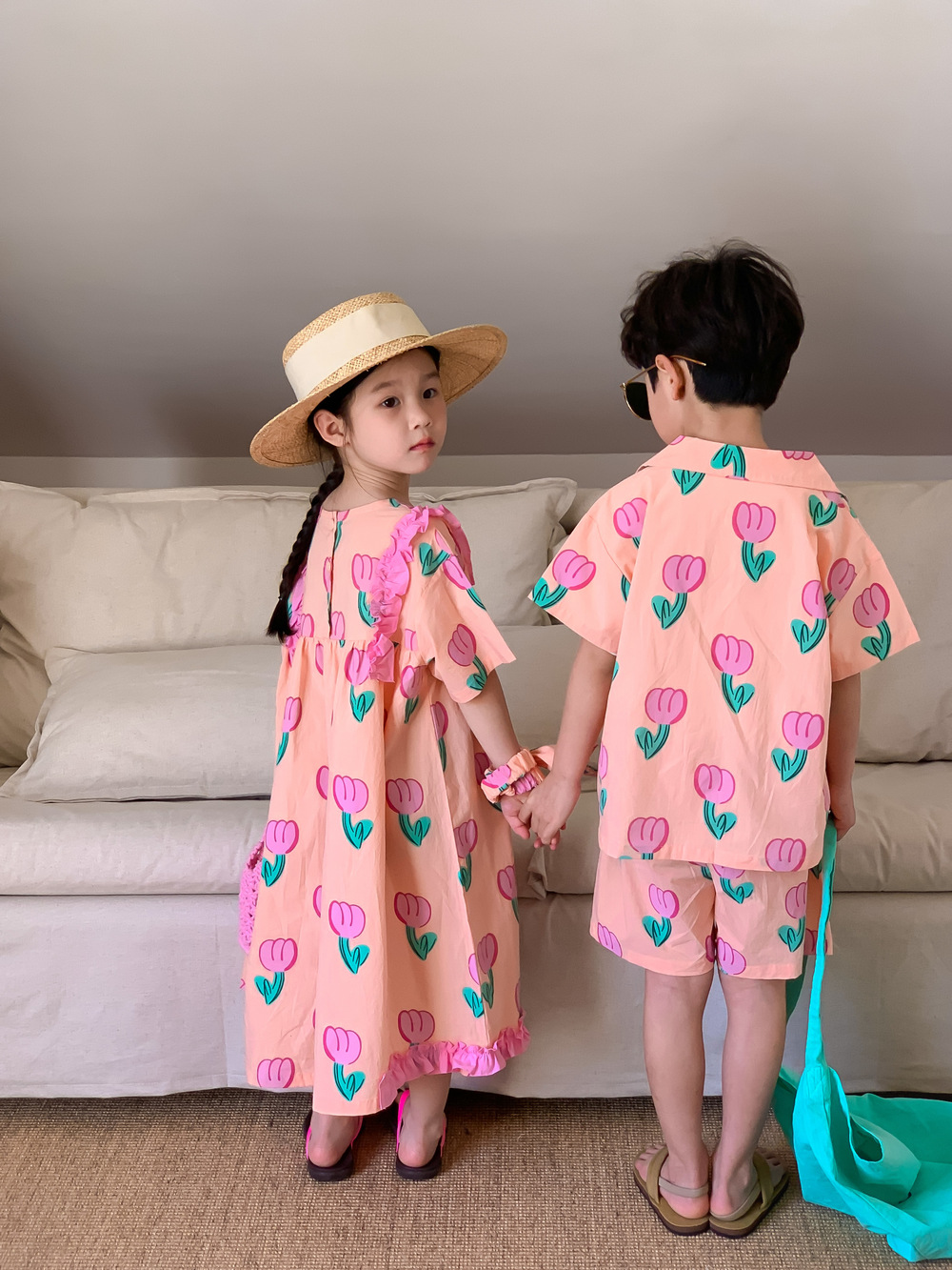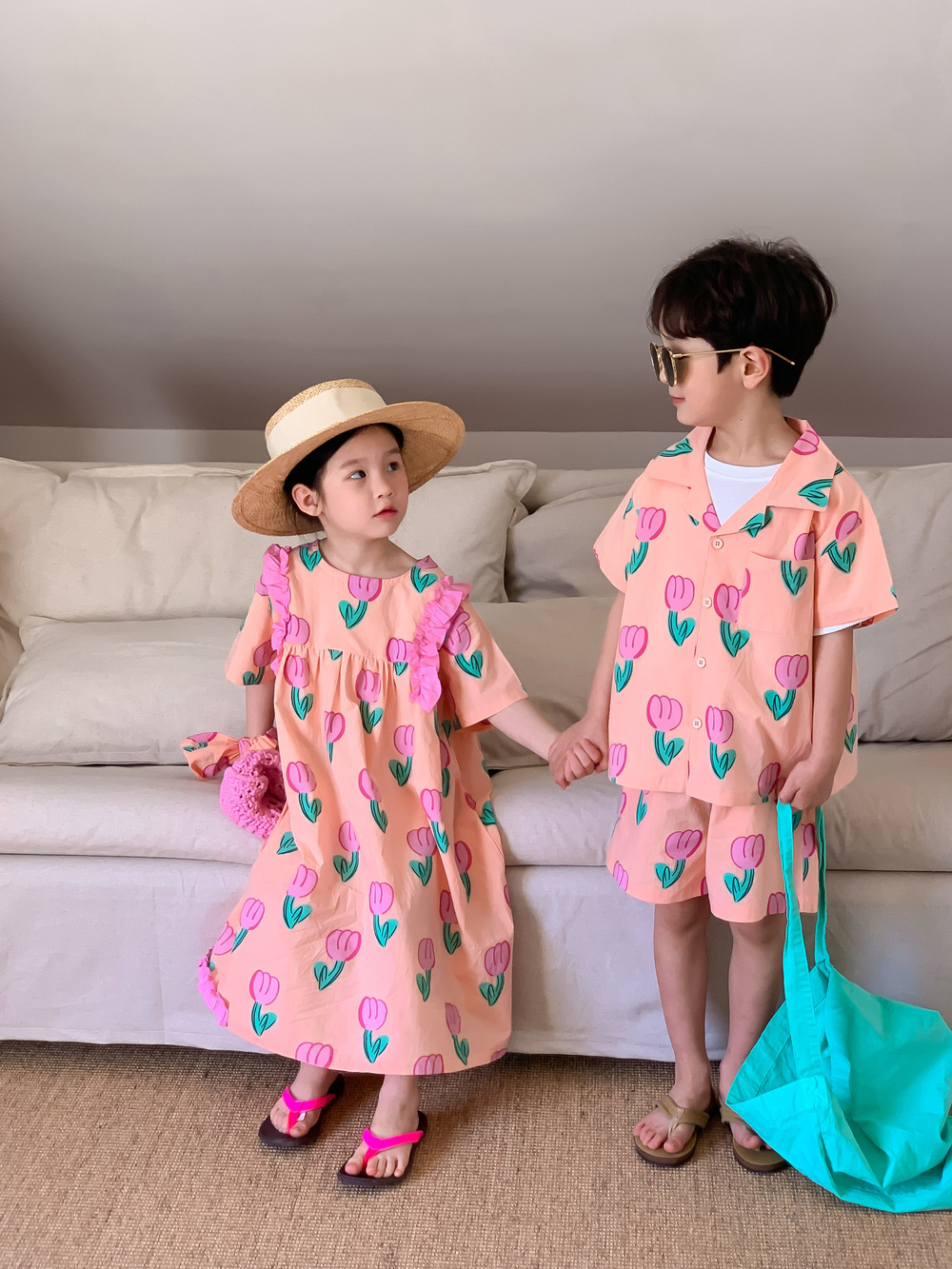 Одежда Brother and Sister 2023, летнее кружевное платье с принтом тюльпана или костюм из двух предметов для мальчиков, рубашка + шорты