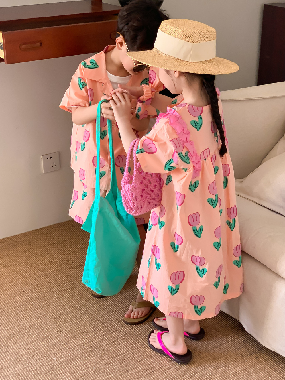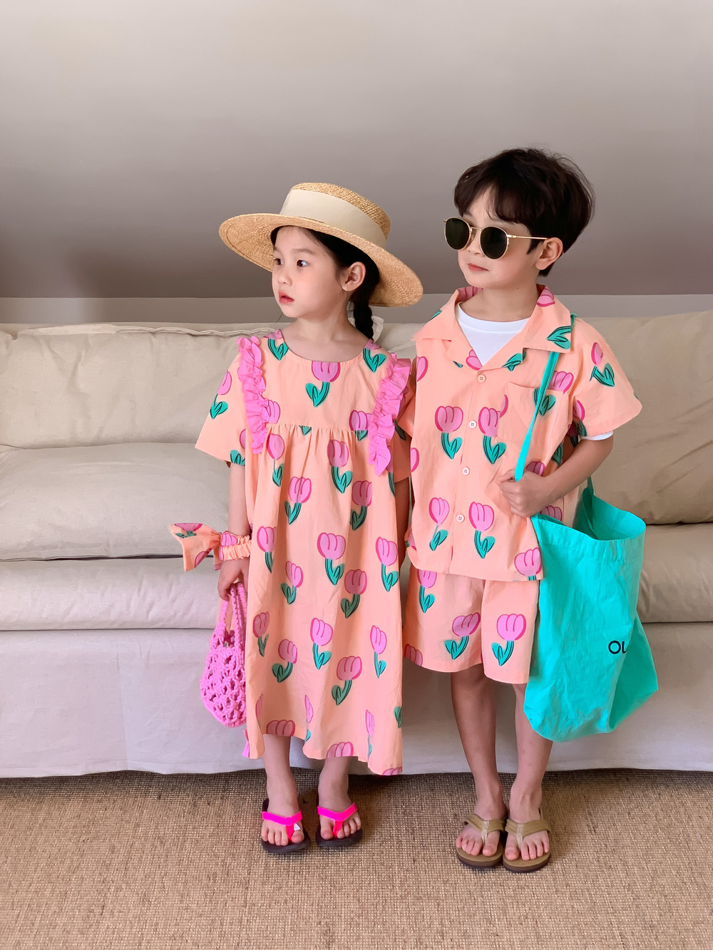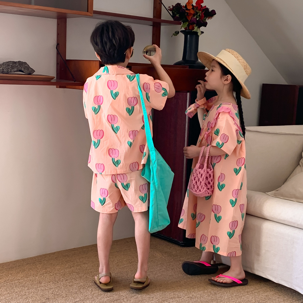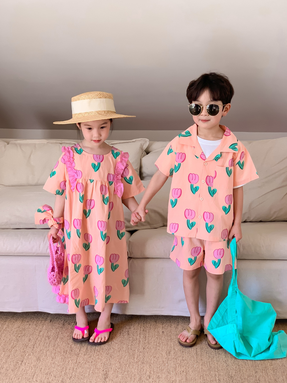 Одежда Brother and Sister 2023, летнее кружевное платье с принтом тюльпана или костюм из двух предметов для мальчиков, рубашка + шорты