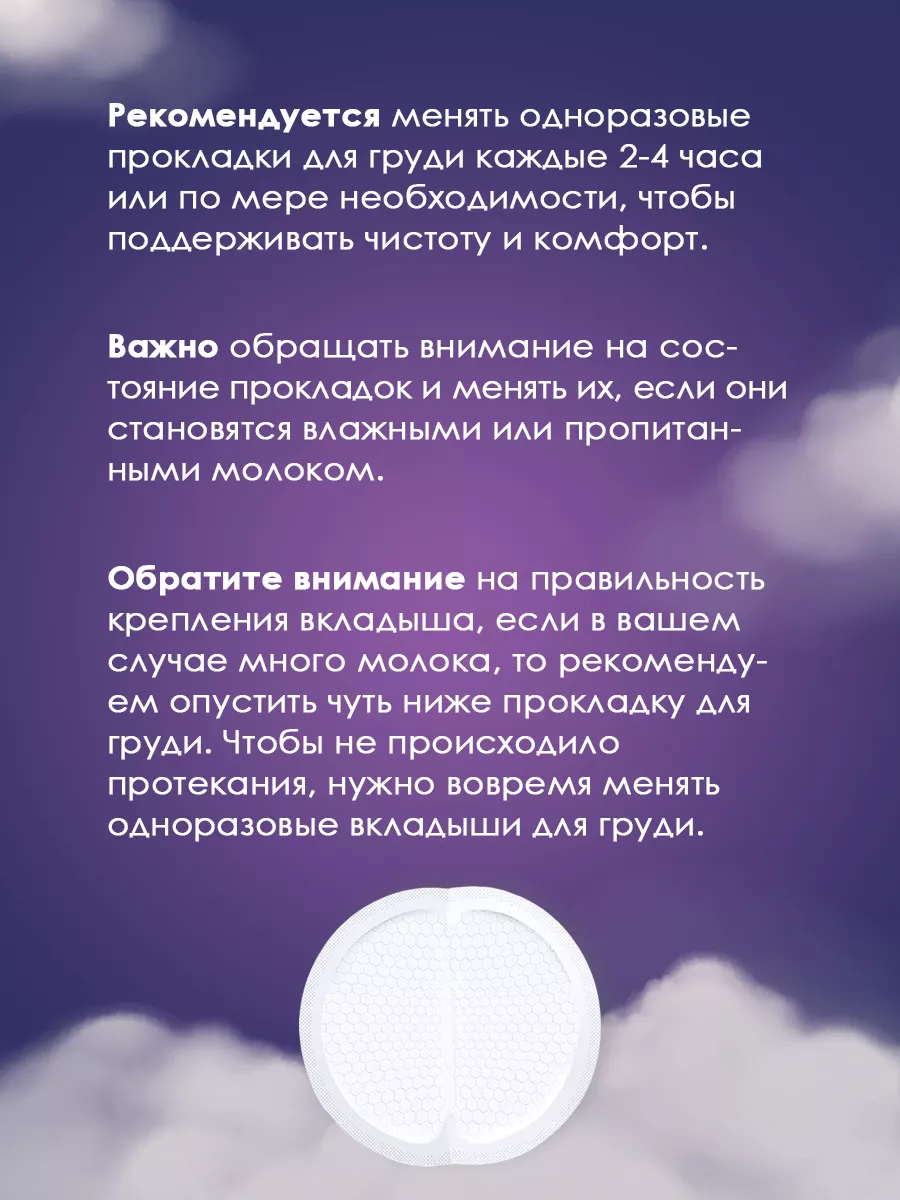 Описание: Одноразовые вкладыши для груди ото KUNDER - это удобные прокладки, специально разработанные для женщин в период кормления грудью. Они идеально подходят для использования в роддоме, послеродовых и кормящих мам. Прокладки обеспечивают максимальную защиту и комфорт для вашей груди. Одноразовые вкладыши для груди имеют анатомическую форму, которая идеально подходит для любых форм и размеров груди. Каждая прокладка супер впитывающая и способна вместить до 150 мл жидкости. Тонкий дизайн прокладок делает их незаметными под одеждой, обеспечивая максимальный комфорт в течение всего дня. Каждый вкладыш для груди поставляется в индивидуальной упаковке, что делает их легкими в использовании и удобными для хранения в сумке или сумке для мамы. Прокладки оснащены клейкой стороной в виде двух полосок, которые позволяют надежно закрепить их к бюстгальтеру, обеспечивая безопасность и гигиеничность использования. Они моментально впитывают влагу, предотвращая протекания и обеспечивая сухость и комфорт. Одноразовые вкладыши для груди изготовлены из нежных материалов, которые позволяют коже дышать. Они безопасны для использования и не вызывают раздражения кожи. Кроме того, прокладки не оставляют ворсинок и легко удаляются, не повреждая кожу груди. Три варианта упаковки по 30, 90 или 60 штук вкладышей для долговременного пользования, что помогает сэкономить ваши средства и обеспечить достаточное количество вкладышей на нужный период времени. Одноразовые вкладыши для груди - это лучшая альтернатива многоразовых вкладышей, комфорт и защита для женщин в период родов и кормления. Незаменимый помощник для современных мам, которые заботятся о своем комфорте и комфорте своего ребенка. Выбирайте надежные, удобные и экономичные вкладыши для груди для полноценного и комфортного кормления вашего малыша.