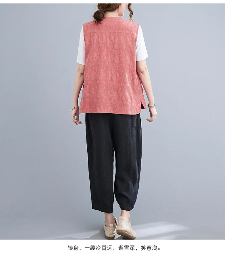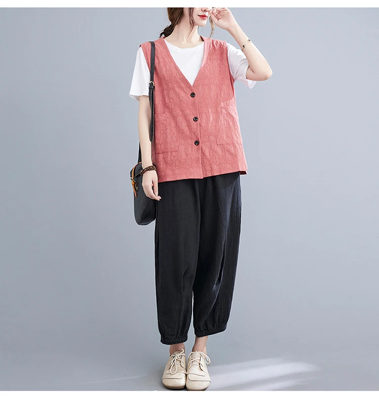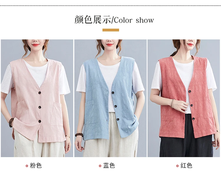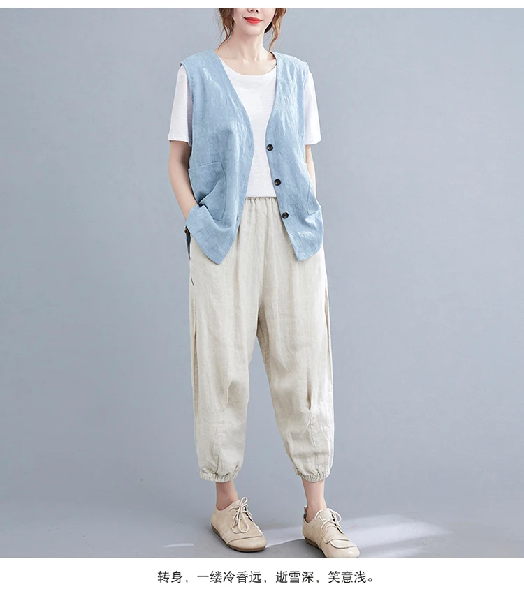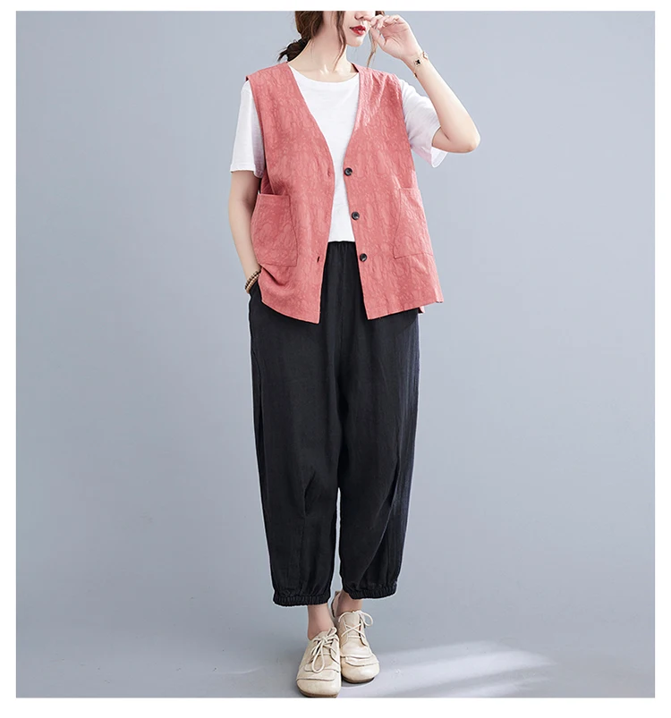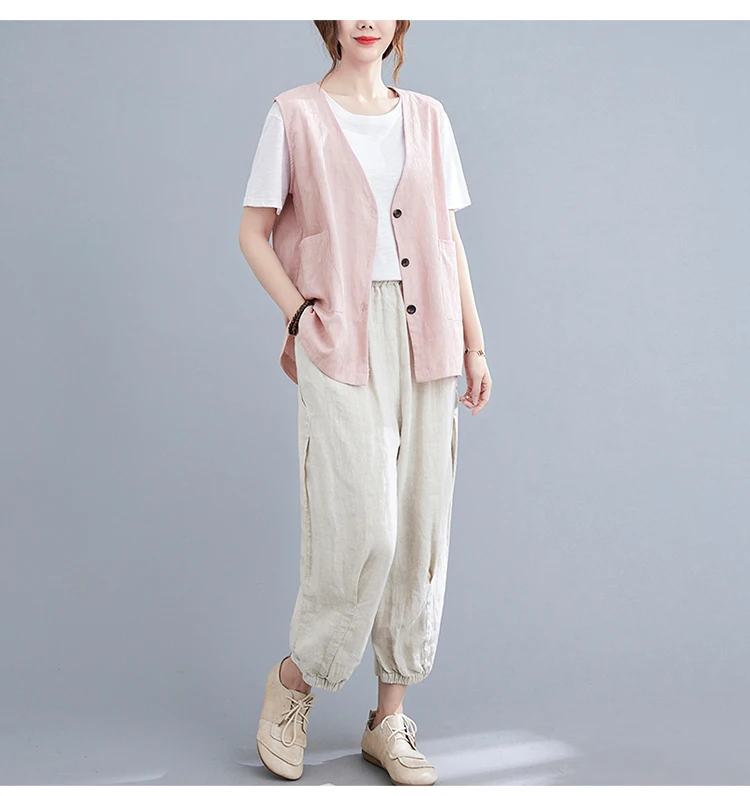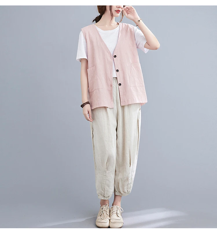 Однотонный жилет из хлопка и льна, женский кардиган с двумя карманами и тремя пуговицами, летний Свободный Топ
