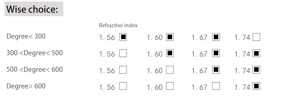 SPH: + 4,00 ~ + 6,00; CYL:+ 0,50 ~ + 2,00