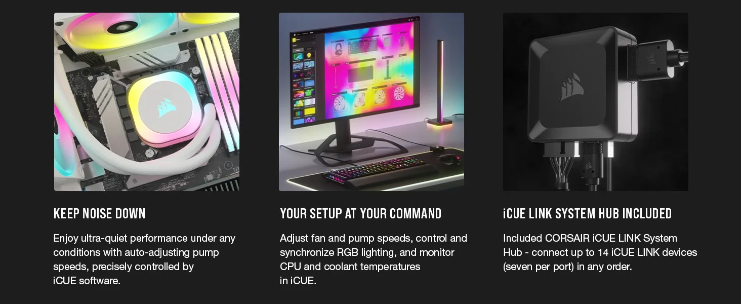 • Охлаждение процессора «Все-в-одном», теперь с iCUE LINK: Добавьте высокопроизводительного охлаждения AIO с низким уровнем шума, чтобы максимально использовать ваш процессор, теперь с упрощенными скрытыми подключениями благодаря патентованной экосистеме iCUE LINK.