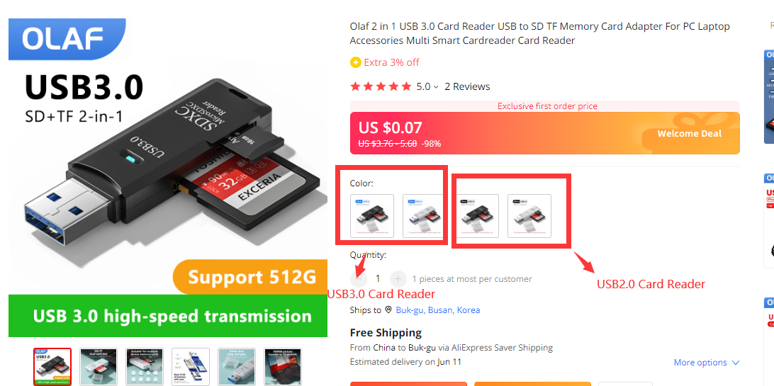 Существует два типа кардридера: один-кардридер USB3.0, а другой-кардридер USB2.0. Пожалуйста, внимательно выберите товар перед размещением заказа.