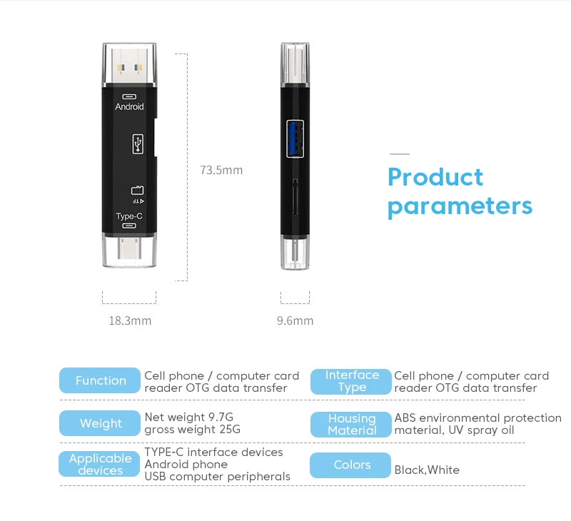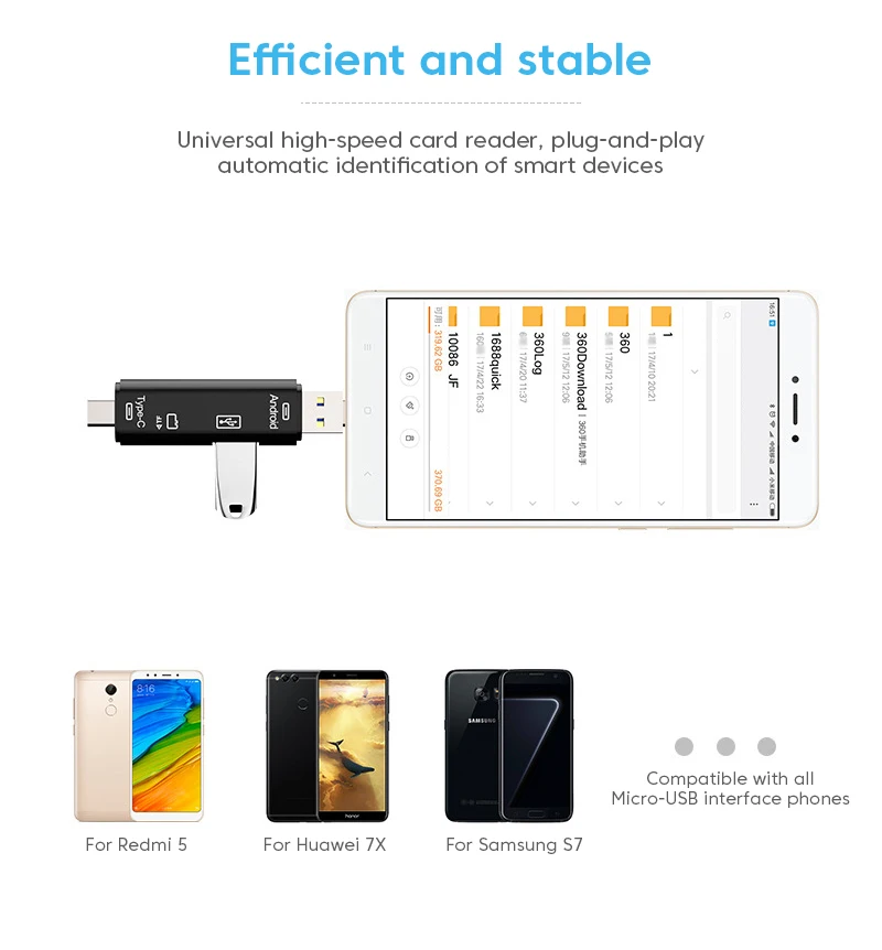 Функции продукта: штекер USB2.0 + штекер MICRO + штекер Type-C, высокоскоростное считывание карты памяти TF, женский интерфейс USB, внешняя клавиатура, мышь, U-диск, U-экран, игровой ручка и другие USB-устройства.