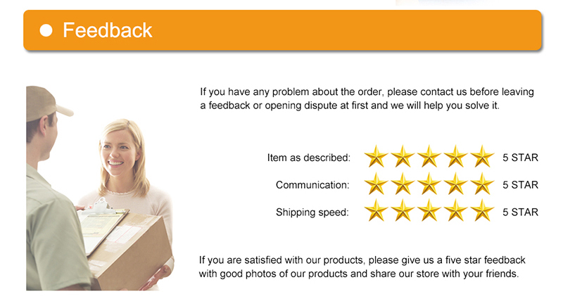 Если вы удовлетворены нашими товарами, пожалуйста, оставьте нам положительные отзывы. Как только вы оставите положительные отзывы, наша система даст вам положительные отзывы в тот же день.