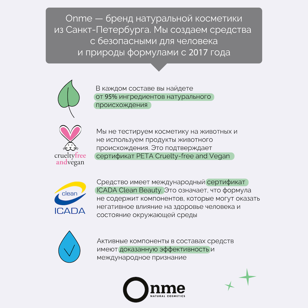 Особенности состава: Без отдушек, Без минеральных масел, Без парабенов, Не тестируется на животных, Без силиконов, Веганская косметика, Подходит для ежедневного применения, Без красителей, Вегетарианская косметика, Натуральные экстракты
