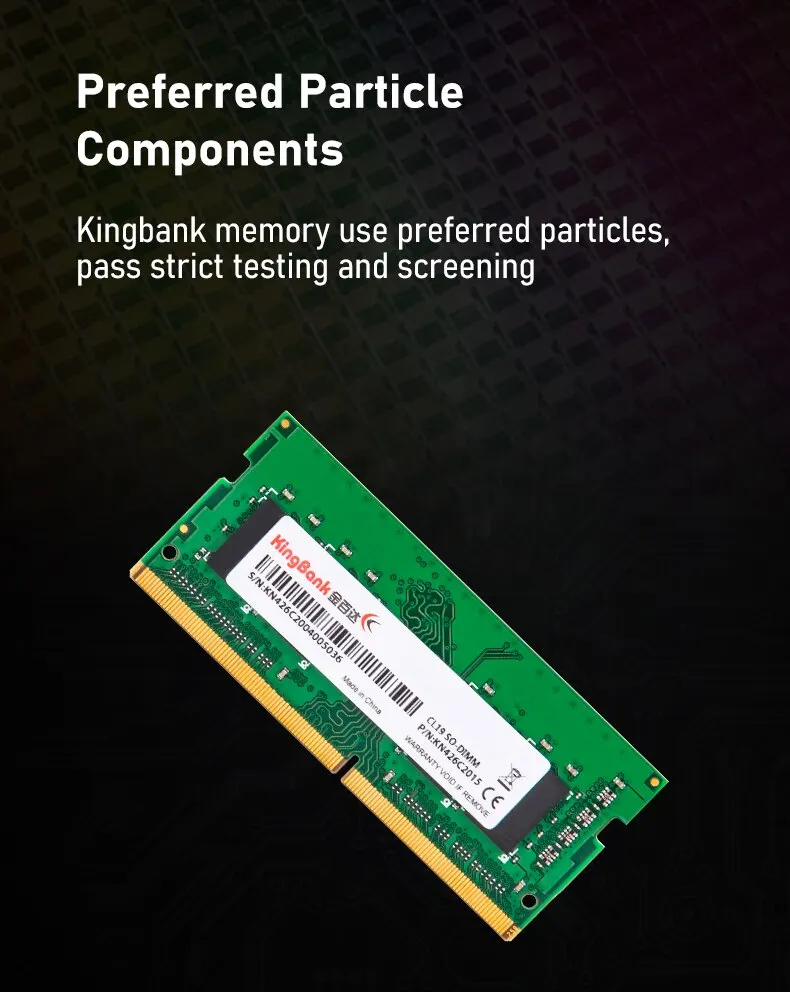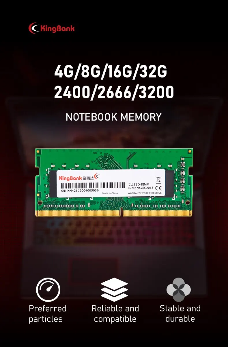• Высокая Производительность:Память оперативной памяти Kingbank DDR4 SODIMM 4G 8 ГБ 16 ГБ 32 ГБ 2400 2666 3200 МГц Memoria Ram DDR 4 для ноутбука Sodimm Memory обеспечивает высокую производительность, обеспечивая плавную и бесперебойную работу вашего ноутбука.