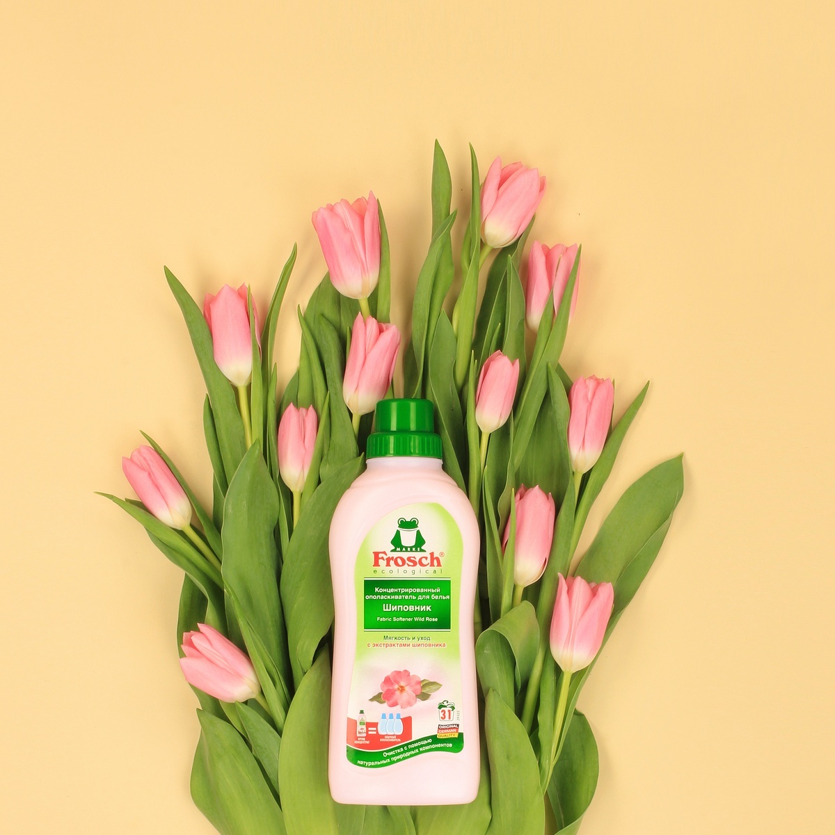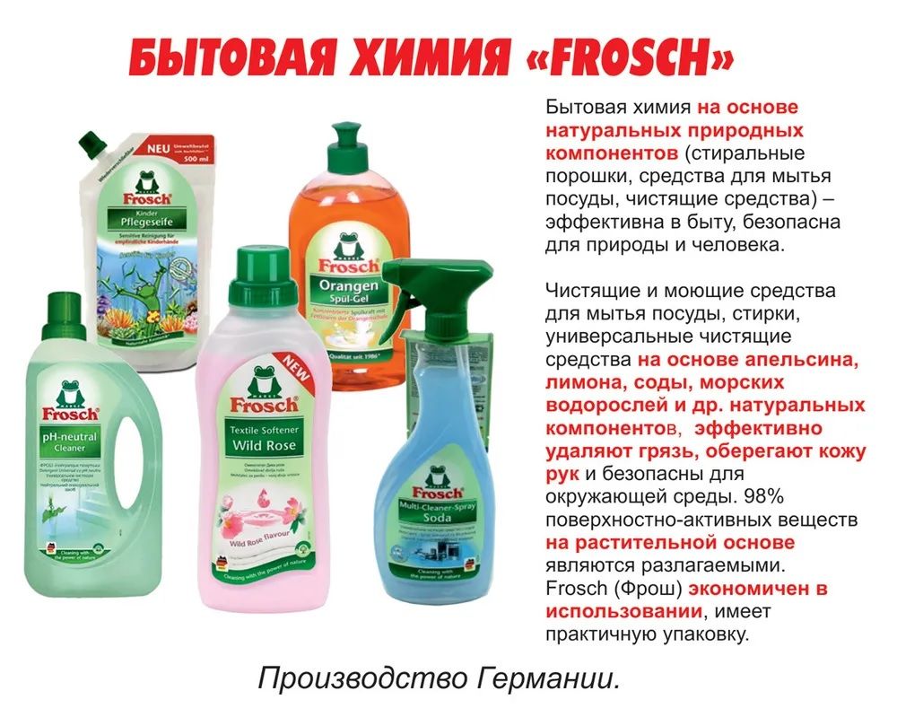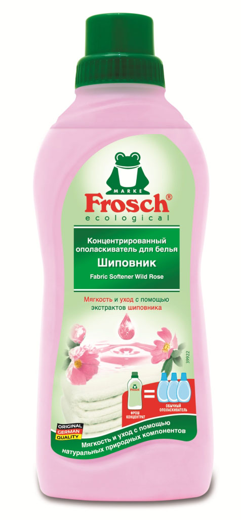 Торговая марка Frosch специализируется на выпуске экологически чистой бытовой химии. Для изготовления своей продукции Frosch использует натуральные природные компоненты. Ассортимент содержит все необходимое для бережного ухода за домом и вещами. Продукция торговой марки Frosch эффективно удаляет загрязнения, оберегает кожу рук и безопасна для окружающей среды. Состав: 5 - <15% катионные ПАВ; 0,1 - < 1%, ароматизирующие добавки. Прочие компоненты: экстракт шиповника, молочная кислота.