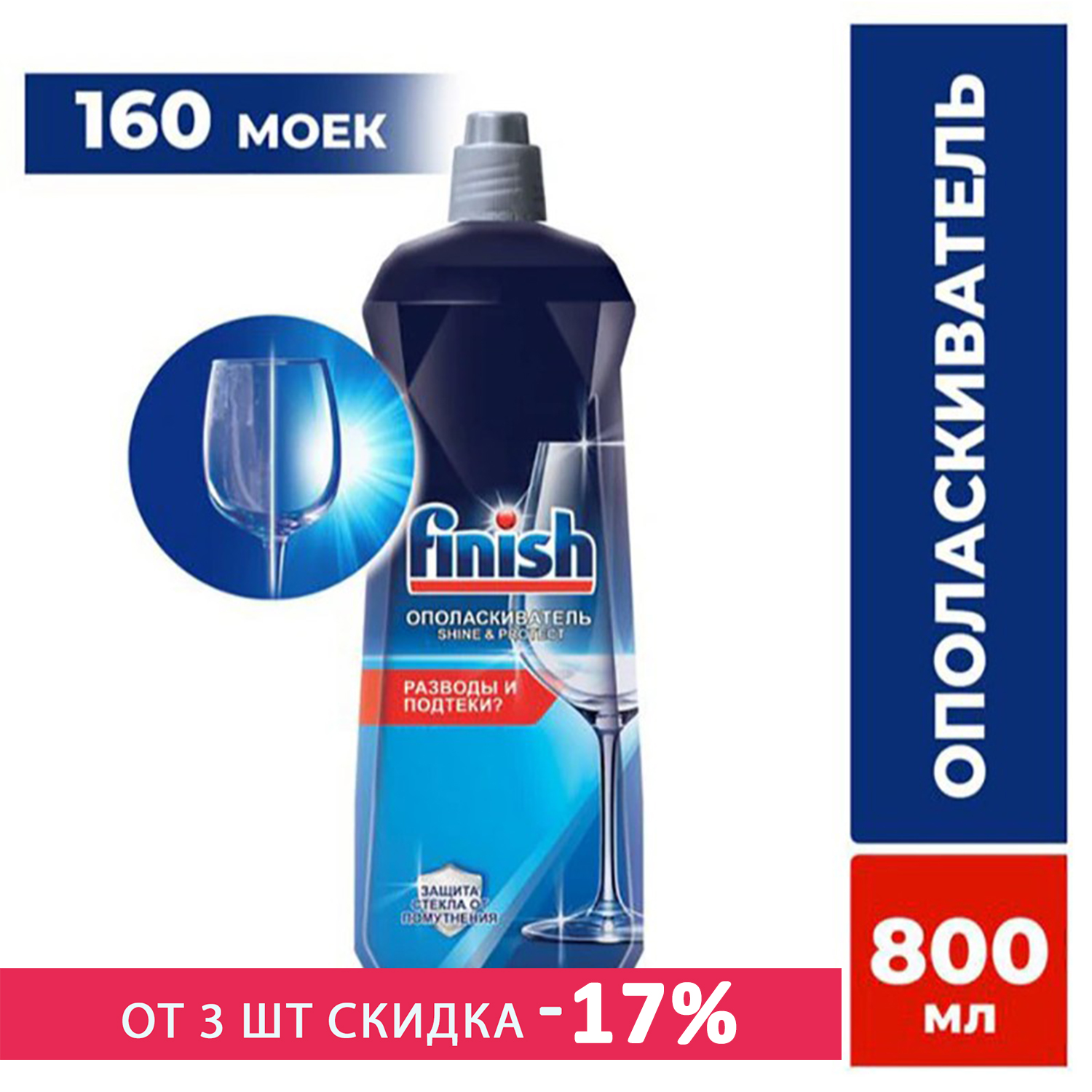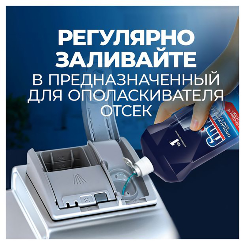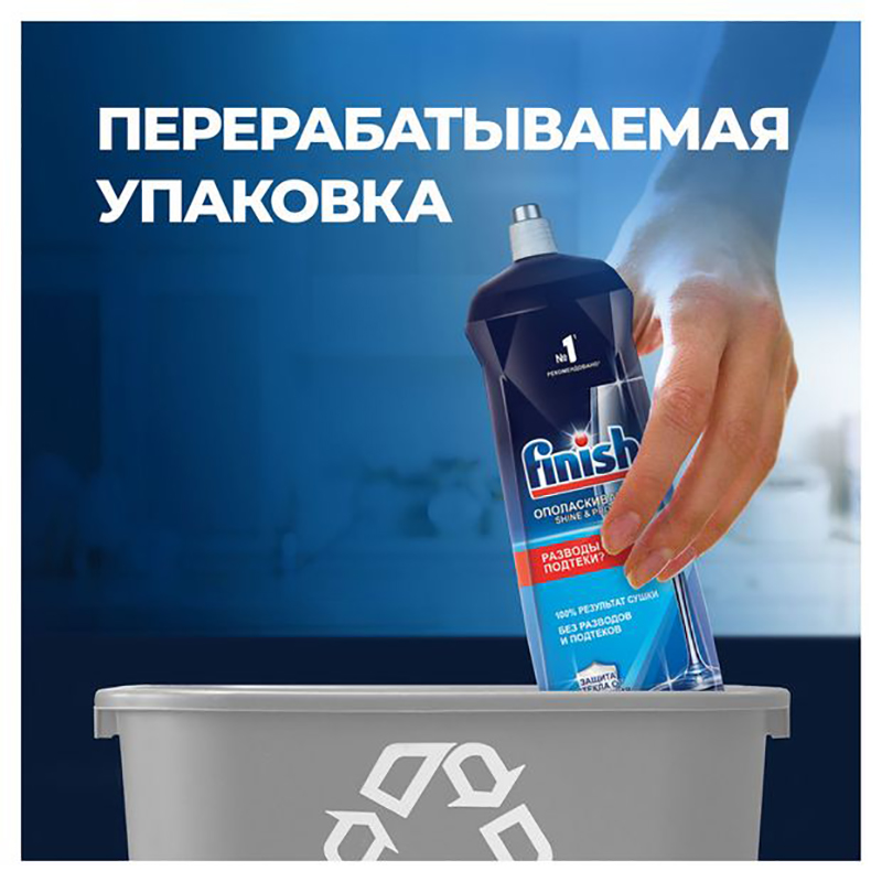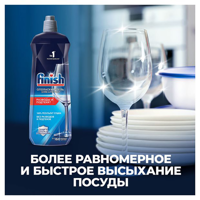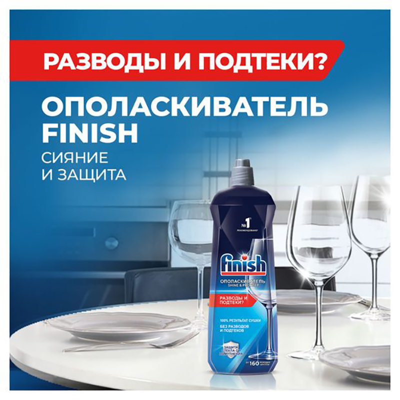 Ополаскиватель для посудомоечных машин Finish. Средство обеспечивает равномерное высыхание посуды без подтеков, разводов. Ополаскиватель для посудомоечной машины борется с помутнением стекла, следами капель, пятнами. Подходит разным материалам: стекло, фаянс, пищевая сталь, силикон. Средство для посудомоечной машины удобно применять: залить в специальный отсек, пополнять при необходимости. Ополаскиватель для посудомоечной машины Finish предотвращает появление известкового налета на деталях посудомоечной машины.