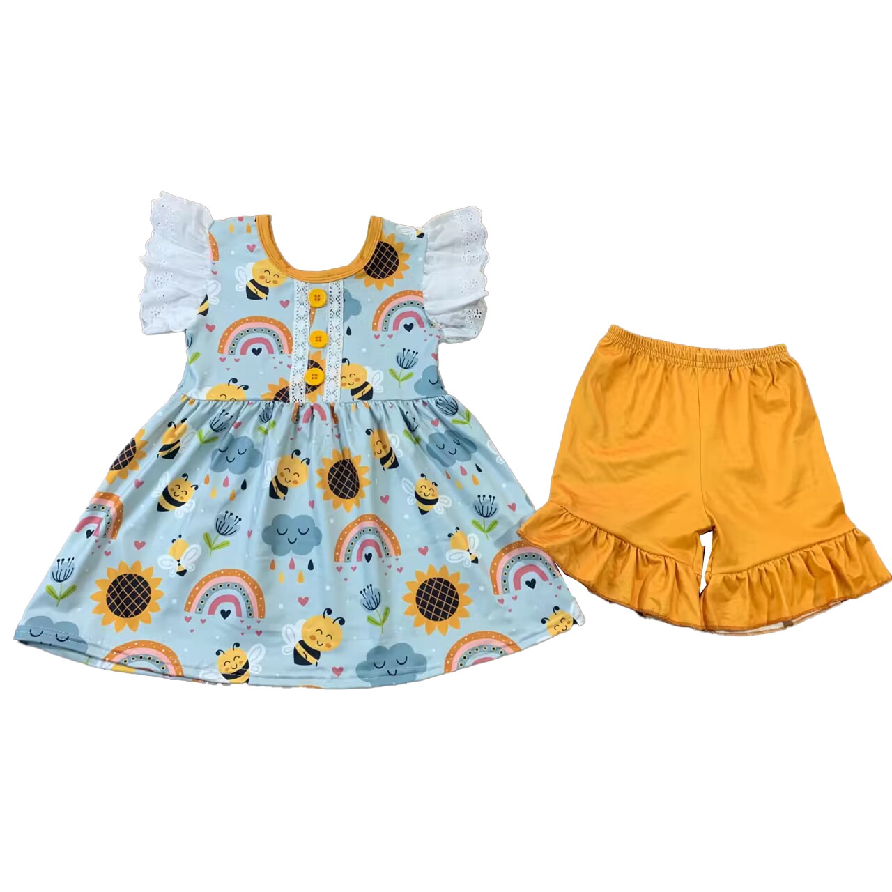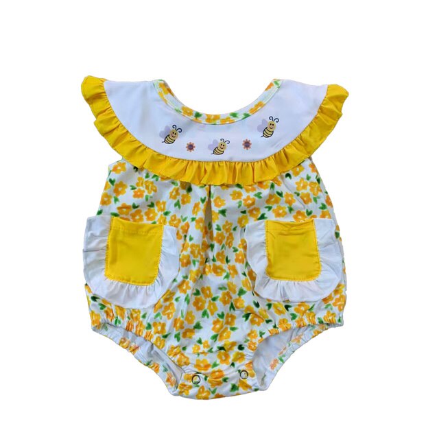 Оптовая продажа, комплекты из 2 предметов для девочек, костюм с шортами с пчелами и рюшами, детские платья, детский комбинезон
